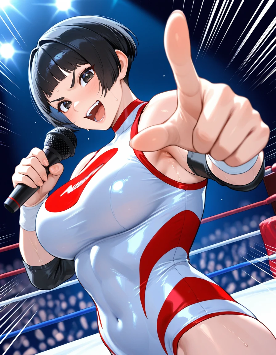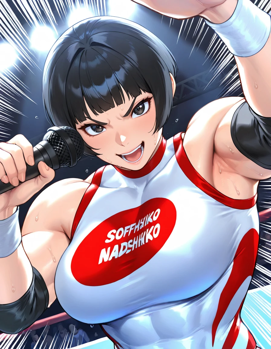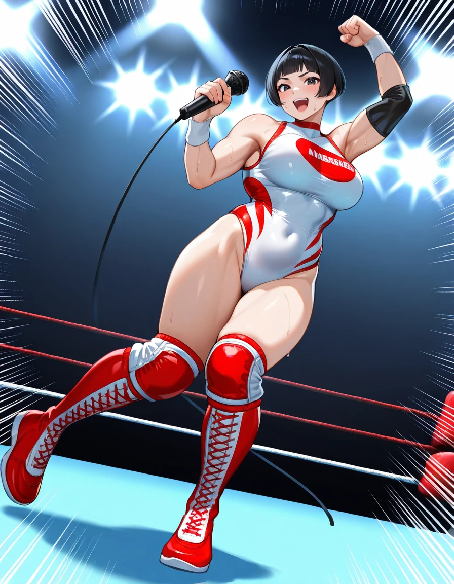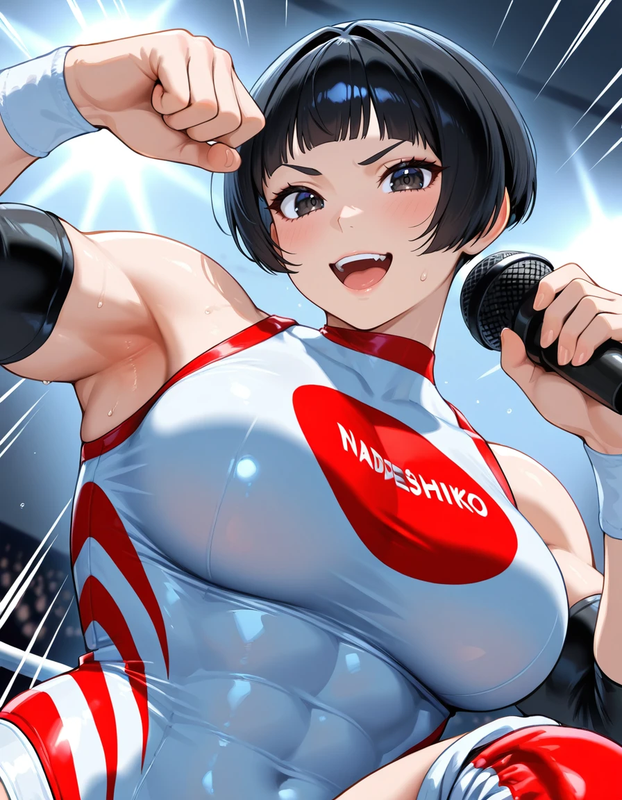 (sfv_nadeshiko), (black eyes, black hair, bowl cut, hair intakes, undercut, , apart), (nadeshiko_leotard, white leotard, nadeshiko_red_circle_text_, nadeshiko_black_single_elbow_sleeve, white wristband, nadeshiko_red_circle_knee_pads, red wrestling boots)