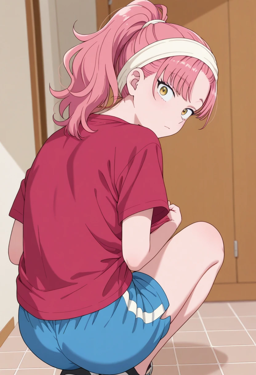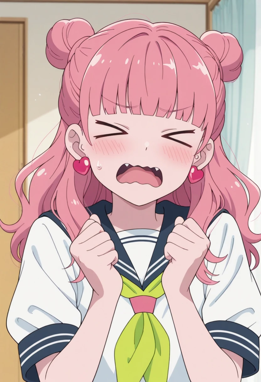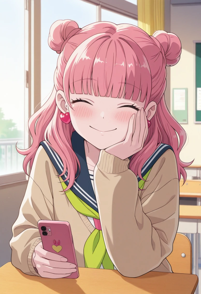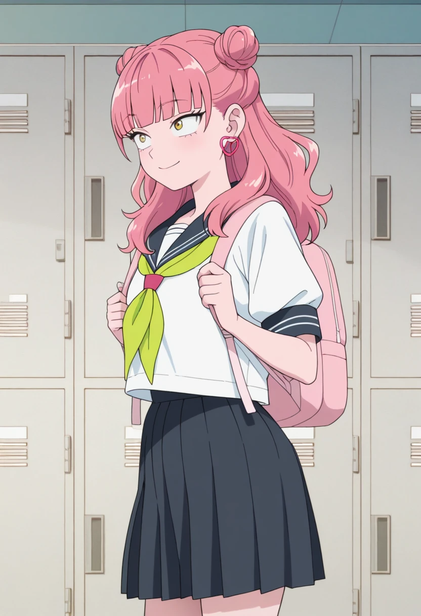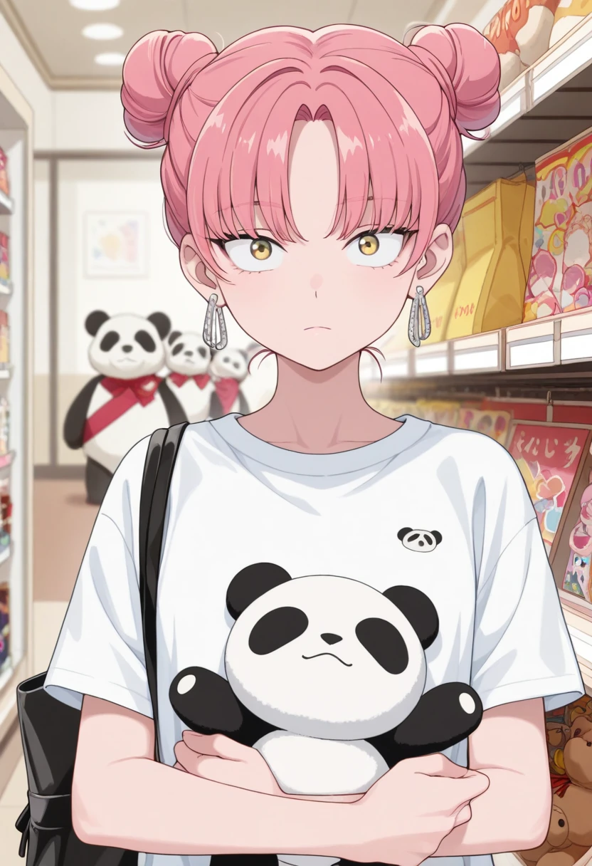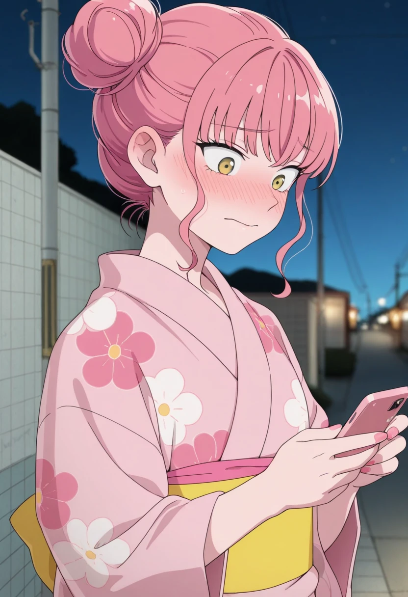 Trigger Words: suzuki miyu, long hair, pink hair, yellow eyes, blunt bangs, hair bun, double bun