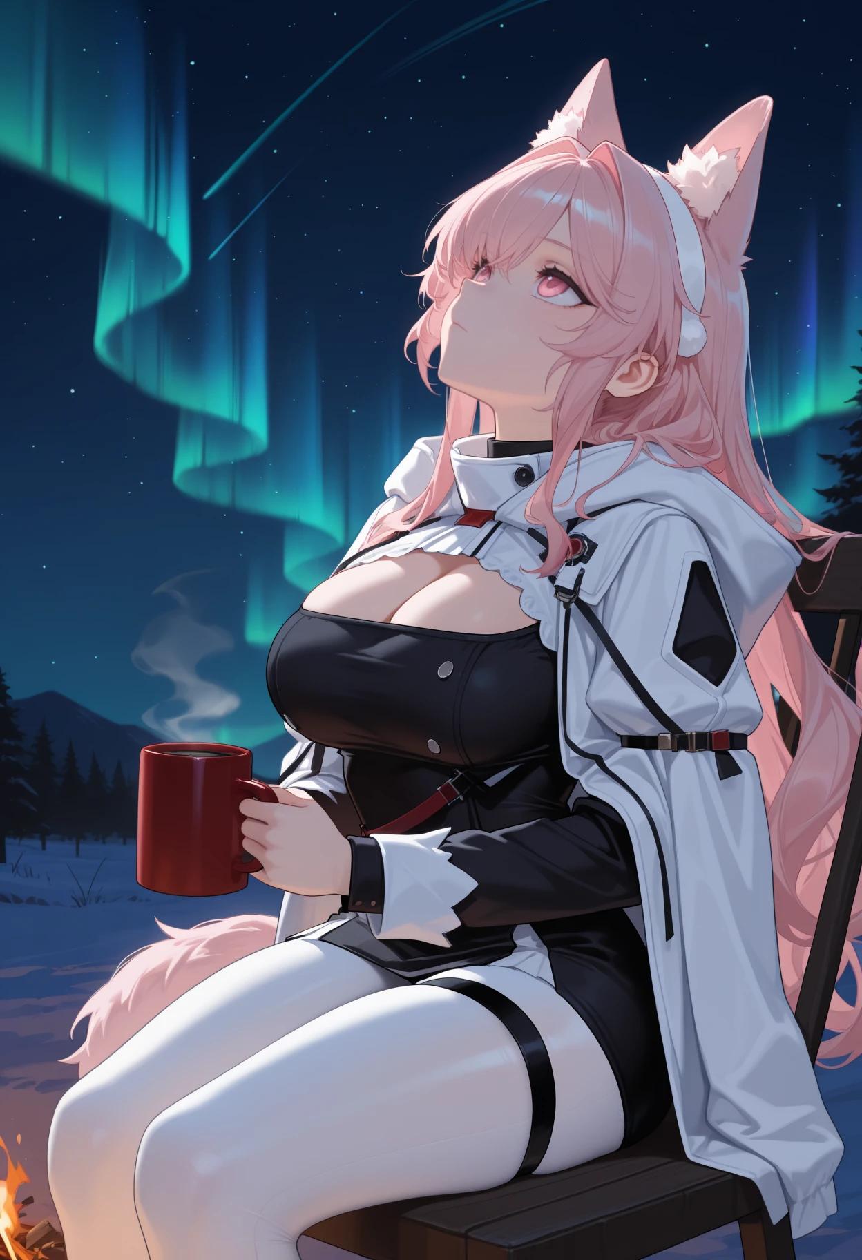 Snowy Plains in Words: pzmksnow, wolf tail, long hair, pink hair, hair intakes, white hairband, animal ears, animal ear fluff, extra ears, pink eyes, white coat, coat on shoulders, hood down, short dress, black dress, long sleeves, white pantyhose, thigh strap, cleavage