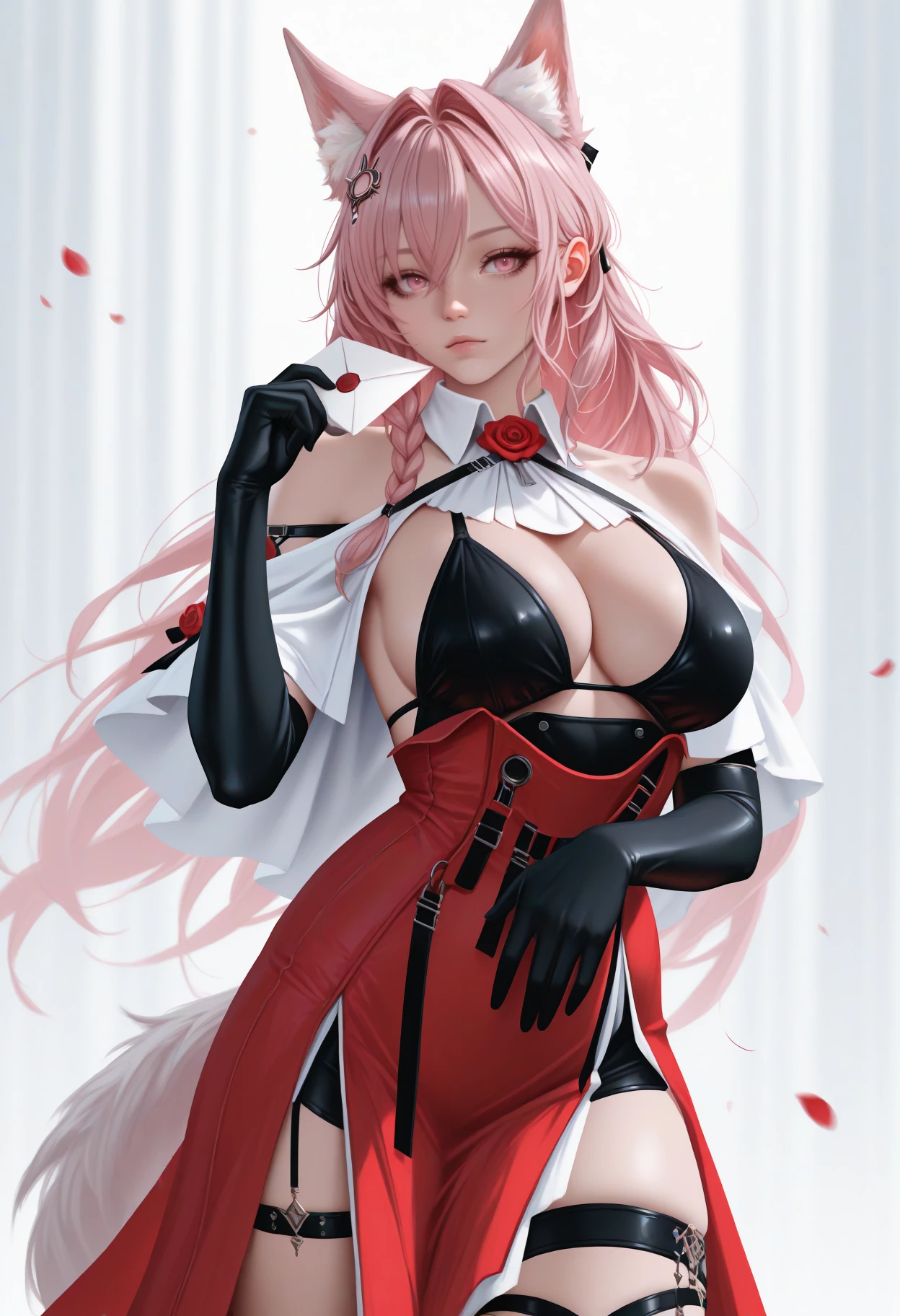 Default Outfit: pzmkdef, wolf tail, long hair, pink hair, hair intakes, hair between eyes, side braid, hair ornament, animal ears, animal ear fluff, extra ears, pink eyes, white capelet, collared capelet, clothing cutout, shoulder cutout, red rose, black bikini, bikini top only, black gloves, elbow gloves, red skirt, high-waist skirt, thigh strap, leg ribbon, bare shoulders, cleavage