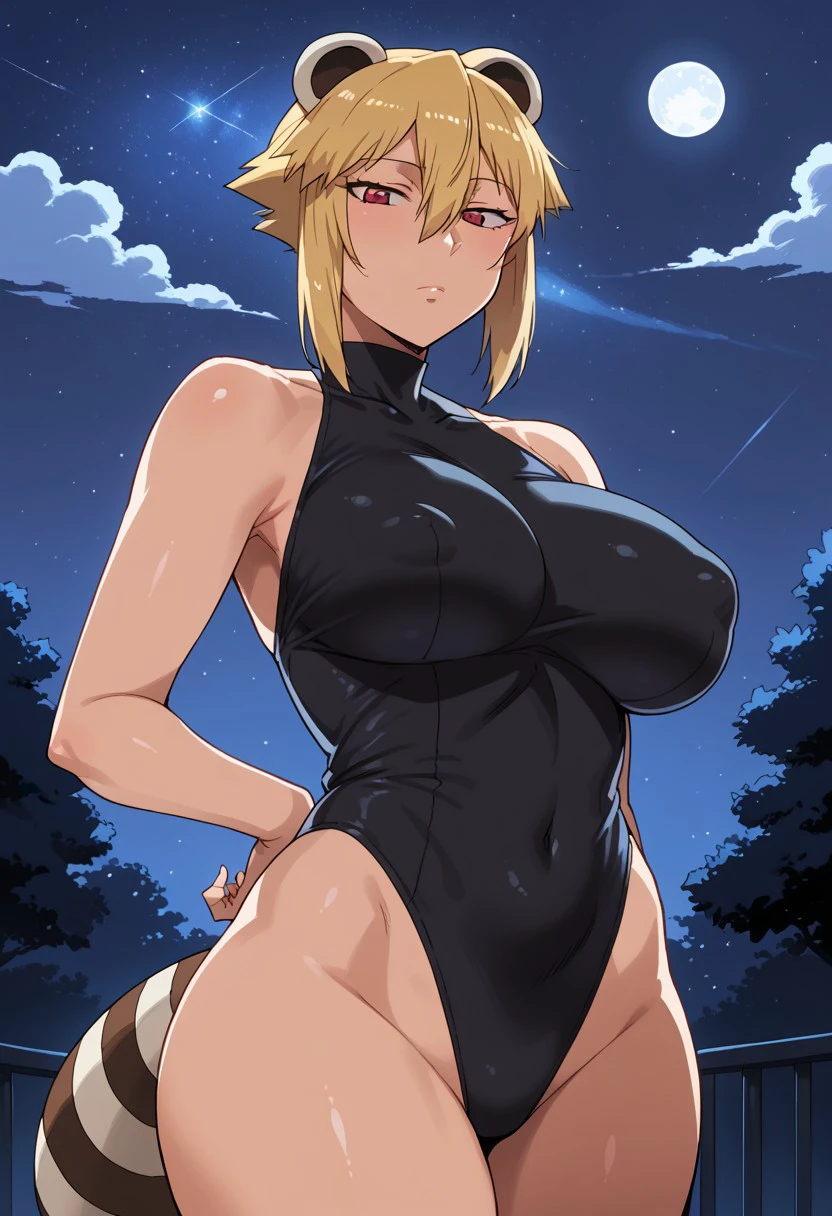 ara1guma-san, blonde hair, red eyes, raccoon tail, raccoon ears, short hair, animal ears