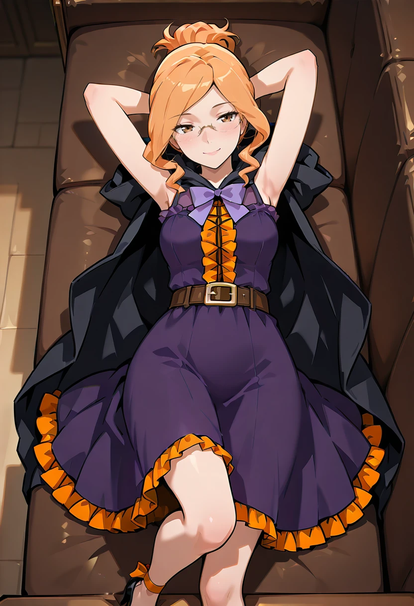 log_henrietta, hallo_henr, orange hair, folded ponytail, brown eyes, semi-rimless eyewear, neck bow, lavender bow, hooded cloak, black cloak, purple dress, frilled dress, orange frills, sleeveless, brown belt, ankle ribbon, orange ribbon, black heelsDescription