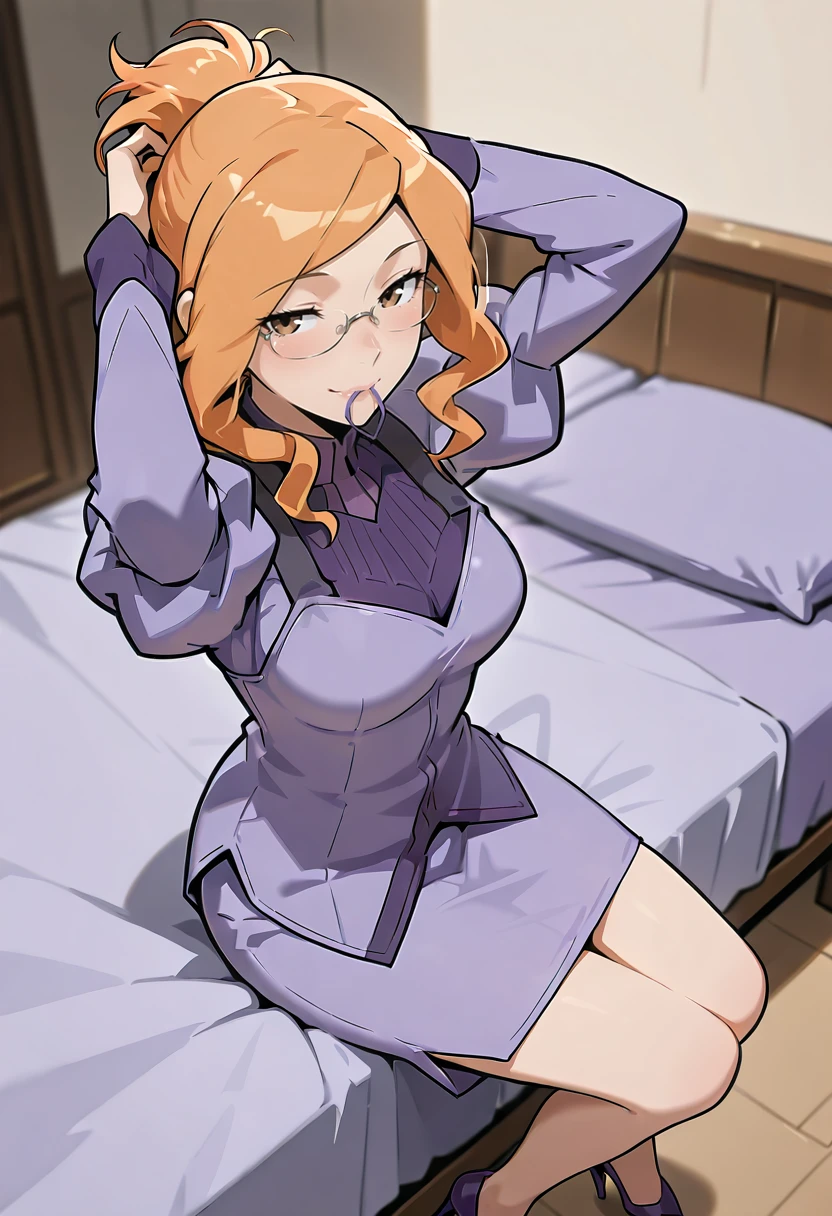 log_henrietta, secr_henr, orange hair, folded ponytail, brown eyes, semi-rimless eyewear, purple shirt, ribbed shirt, untucked shirt, lavender dress, juliet sleeves, lavender skirt, pencil skirt, purple heelsCombat