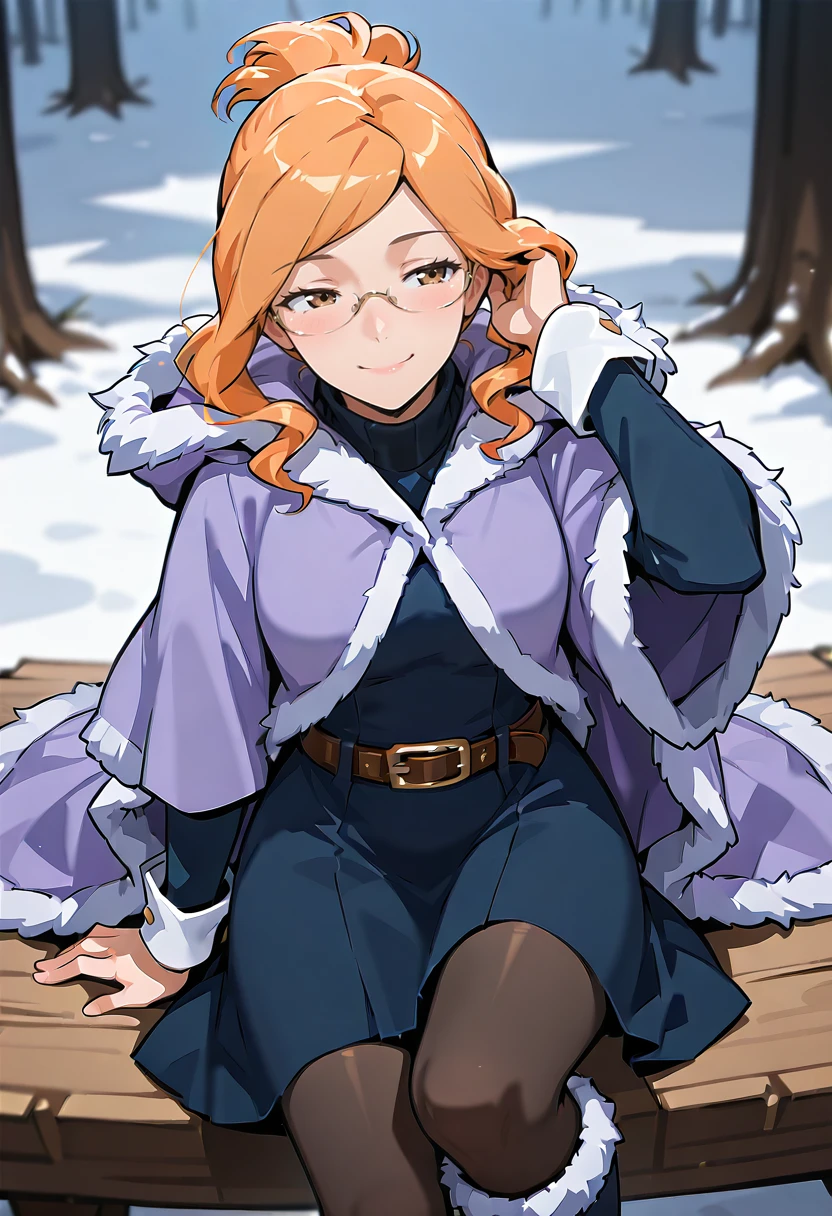 log_henrietta, winter_henr, orange hair, folded ponytail, brown eyes, semi-rimless eyewear, hood down, lavender cloak, hooded coat, fur-trimmed coat, short sleeved coat, turtleneck dress, blue dress, long sleeved dress, white wrist cuffs, brown belt, pantyhose, fur-trimmed boots, knee boots, blue boots