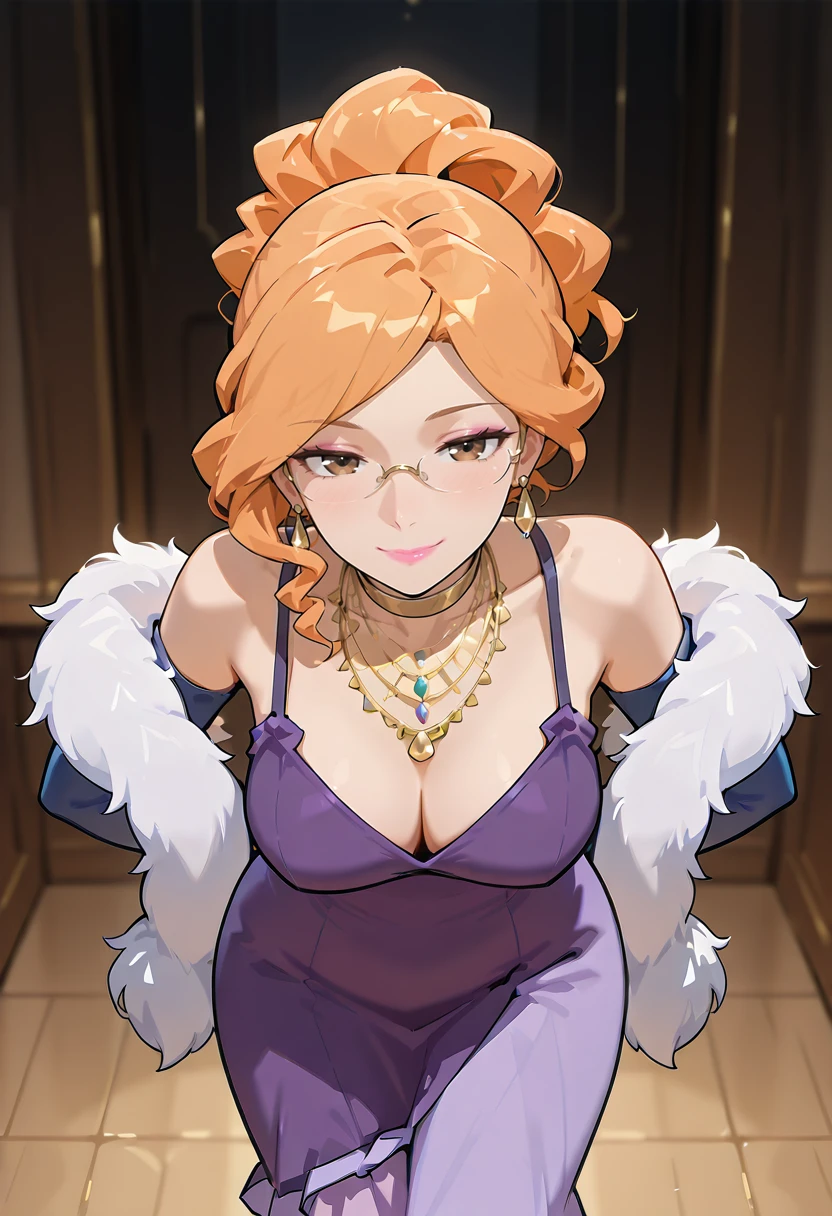 log_henrietta, ewear_henr, orange hair, high ponytail, brown eyes, semi-rimless eyewear, pink lipstick, earrings, gold choker, multiple necklaces, feather boa, purple dress, off-shoulder dress, blue gloves, elbow gloves, layered dress, lavender skirt