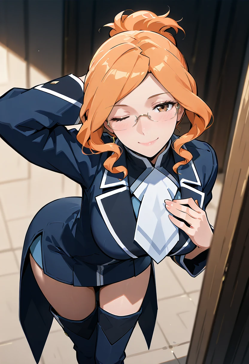 log_henrietta, rtable_henr, orange hair, folded ponytail, brown eyes, semi-rimless eyewear, white trim, white necktie, blue dress, short dress, blue coat, , tailcoat, blue boots, thigh boots