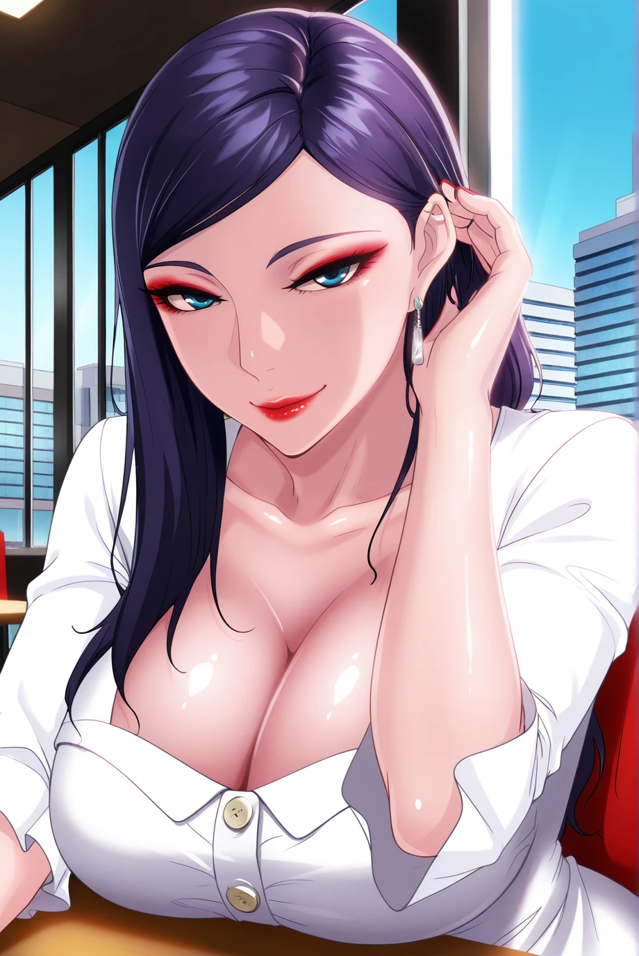 <lora:Hye-Young-IL-v1-08:0.9>, ChopioHyeYoung, long hair, hair behind ear, purple hair, shiny hair, swept bangs, earrings, eyelashes, red lips, red eyeshadow, blue eyes, looking at viewer, mature female, large breasts, red nails, wide hips,