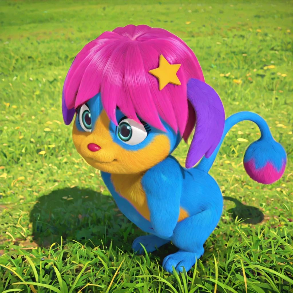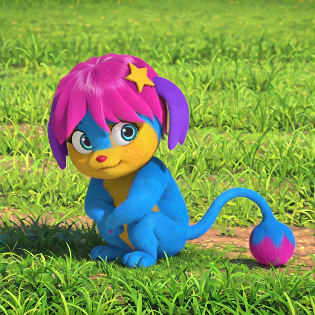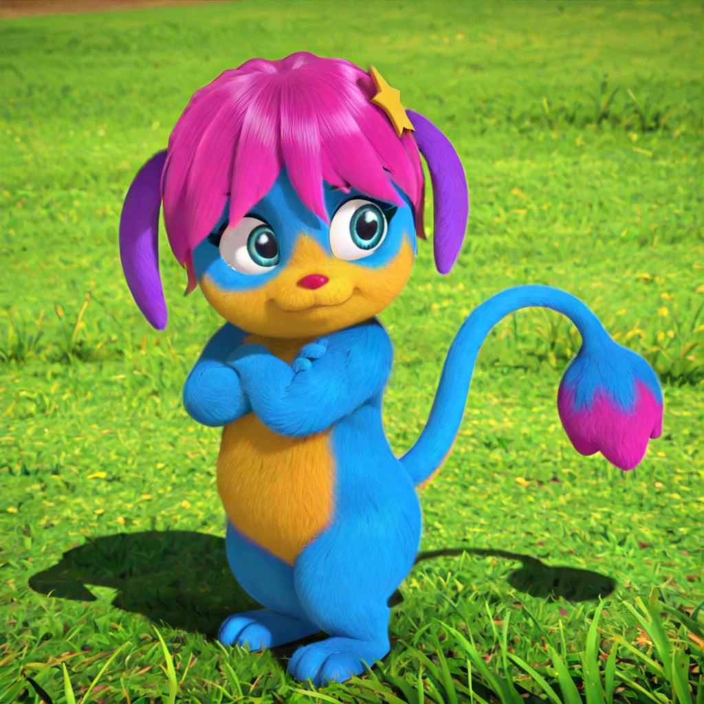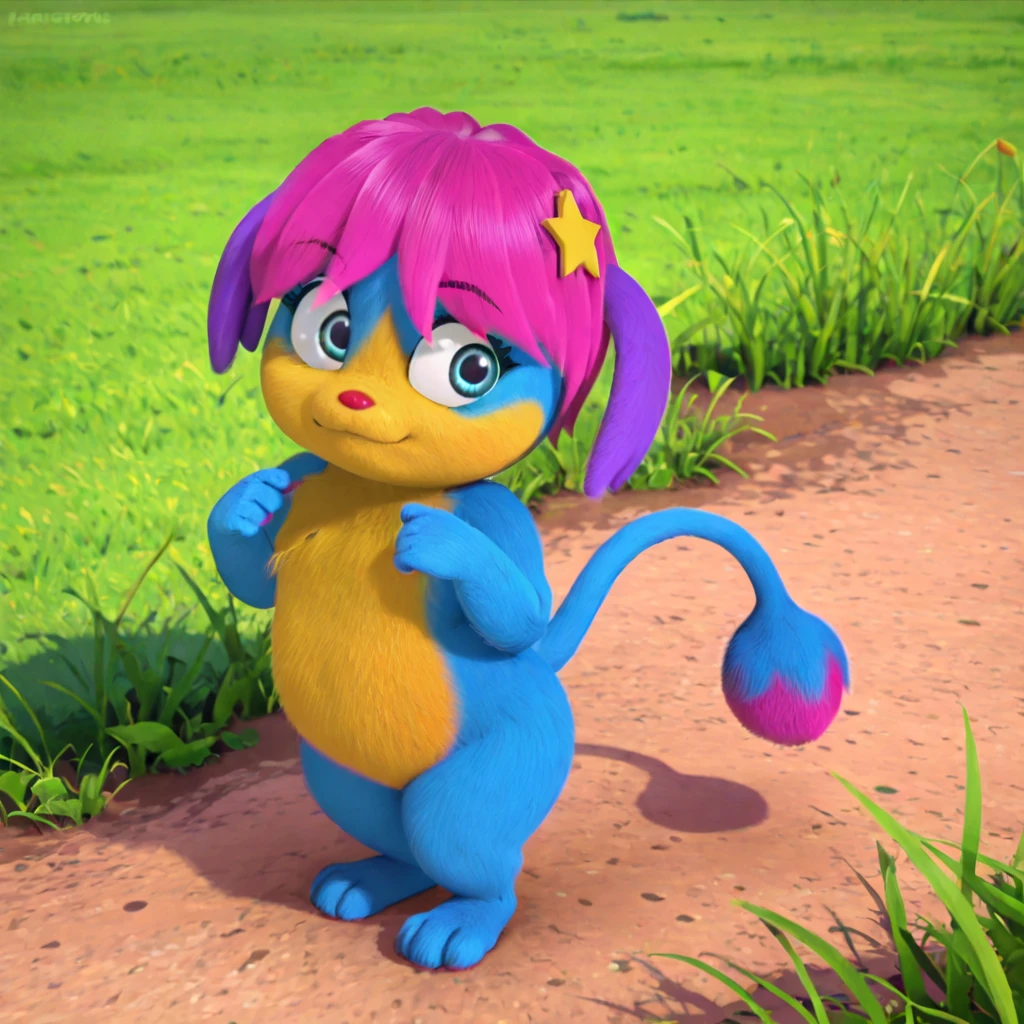 female, anthro, blue fur, yellow fur, yellow muzzle, hot pink hair, purple ears, blue eyes, eyebrows, red nose, short stack, star in hair, long tail, hot pink tip of the tail, round end of the tail
