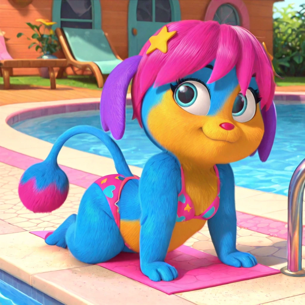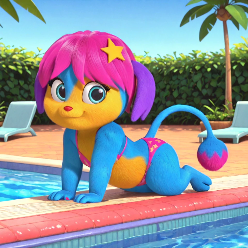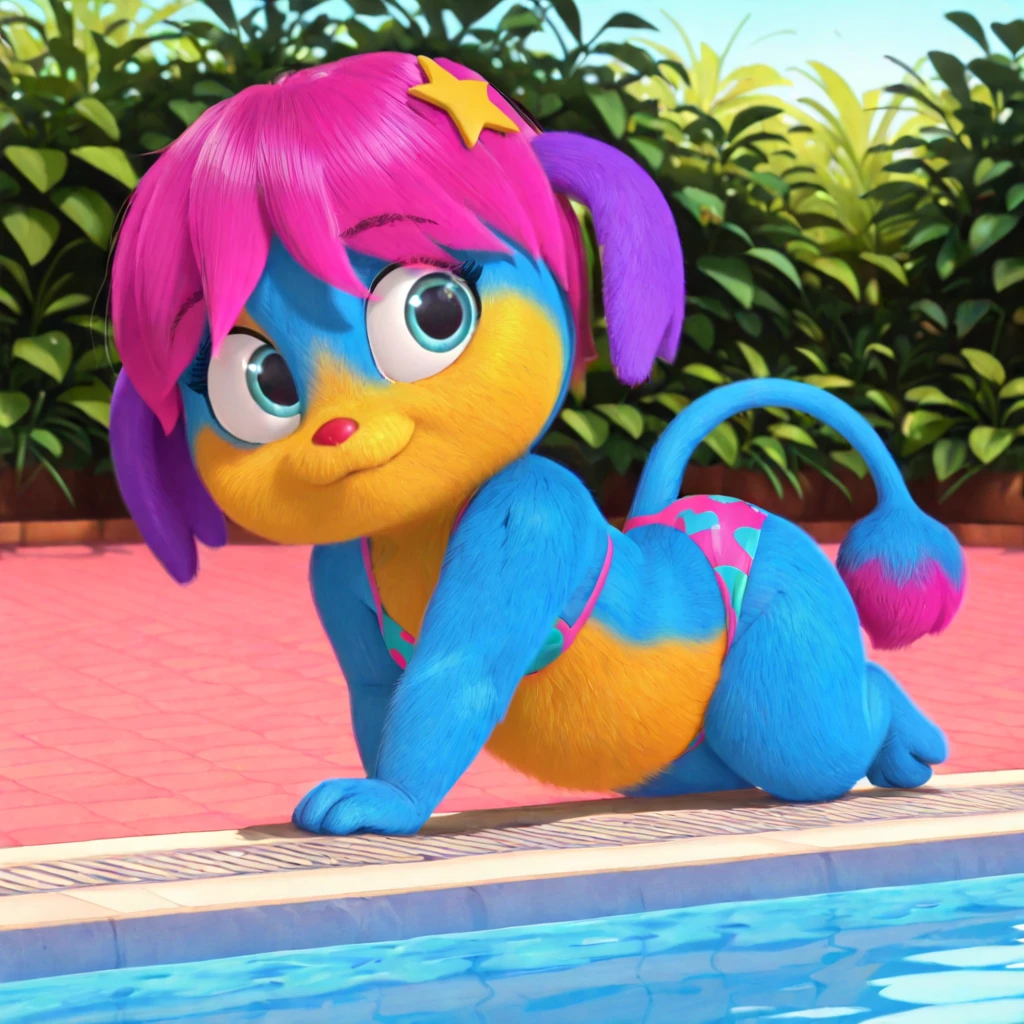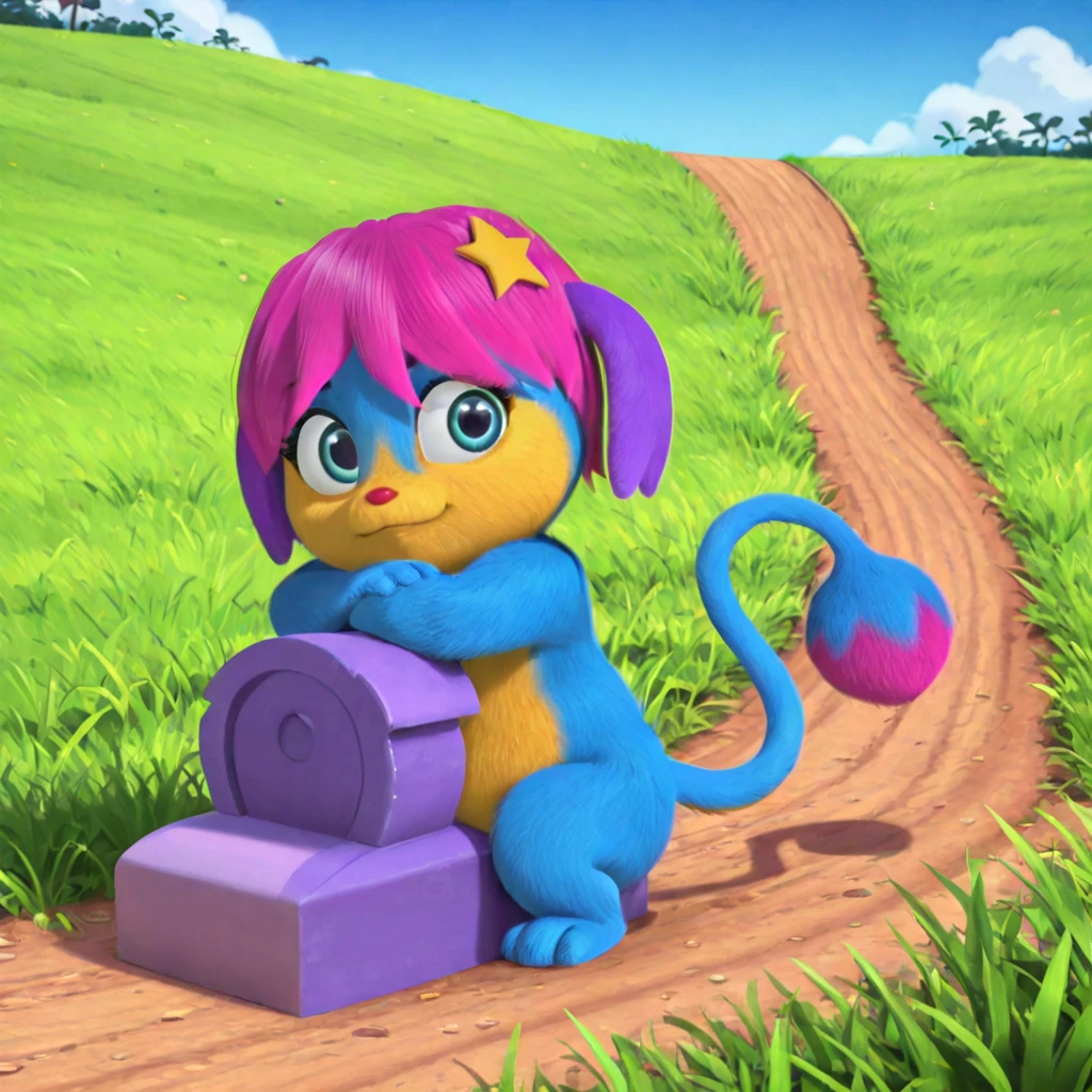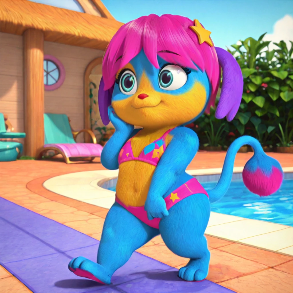 female, anthro, blue fur, yellow fur, yellow muzzle, hot pink hair, purple ears, blue eyes, eyebrows, red nose, short stack, star in hair, long tail, hot pink tip of the tail, round end of the tail