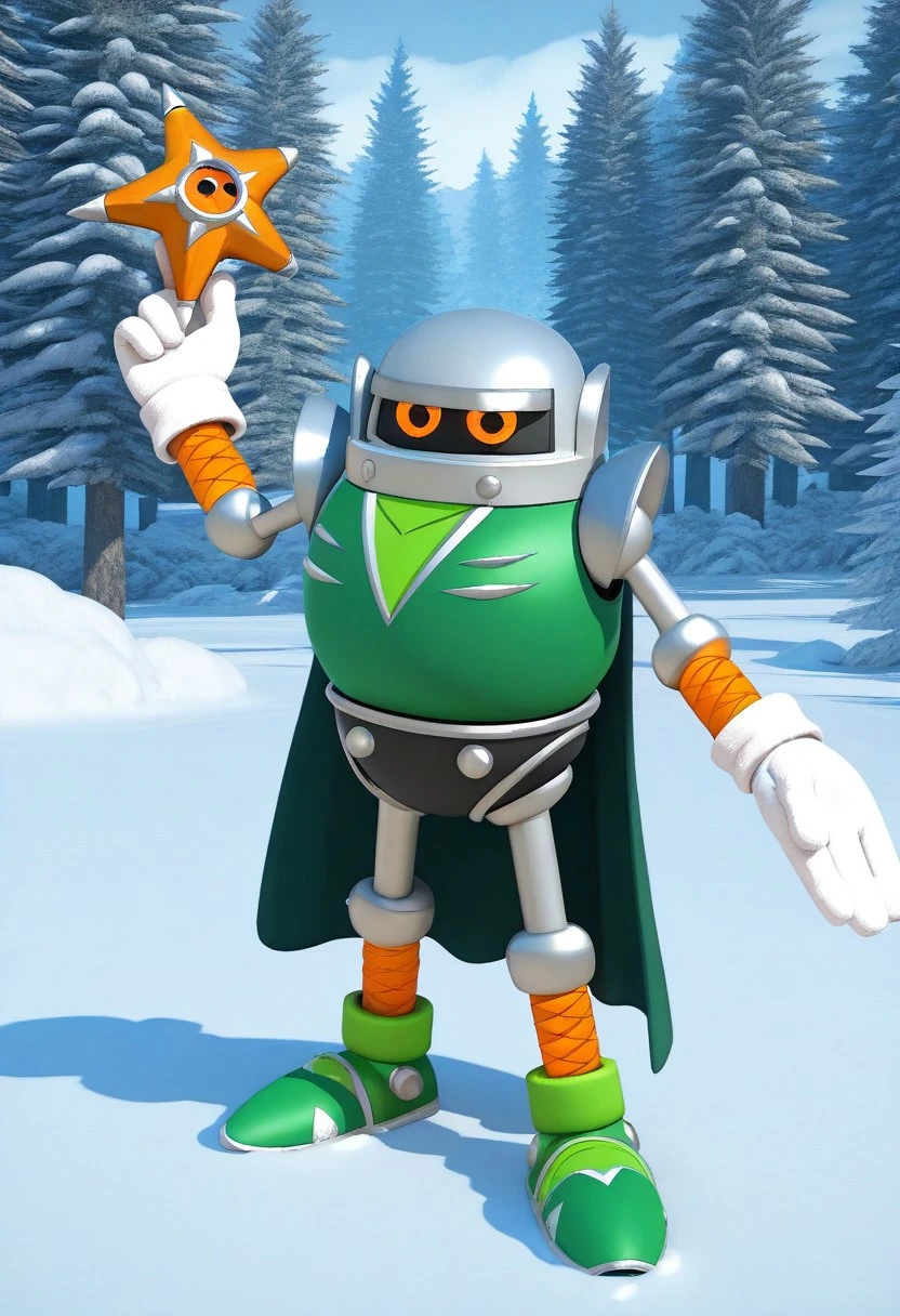 Heavy Shinobi, robot, gray metal skin, orange eyes, green shirt, gray pants, long green cape, holding katana, holding yellow throwing star, green shoes, white gloves