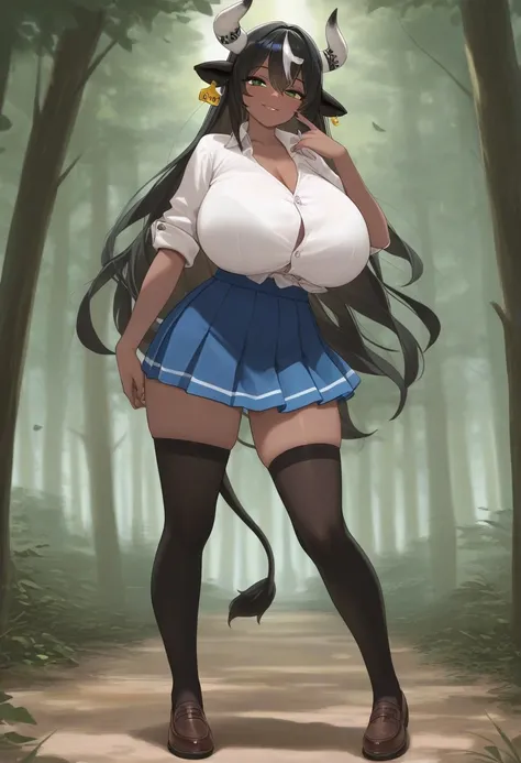 Petunia, dark skin , green eyes,black hair,long hair , streaked hair , animal ears ,cow ears , cow horns , huge breasts, cow tail, white shirt , blue skirt, black stocking,brown shoes,