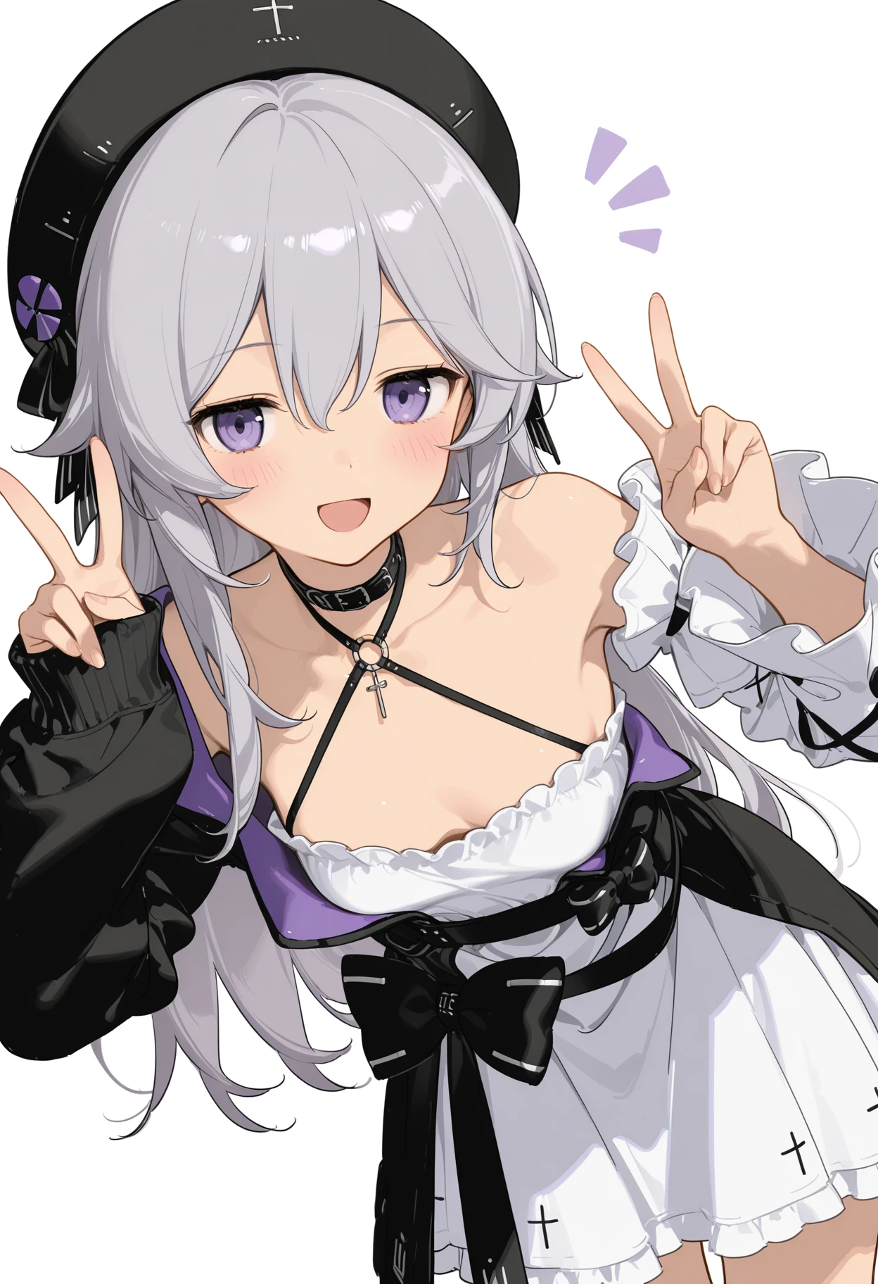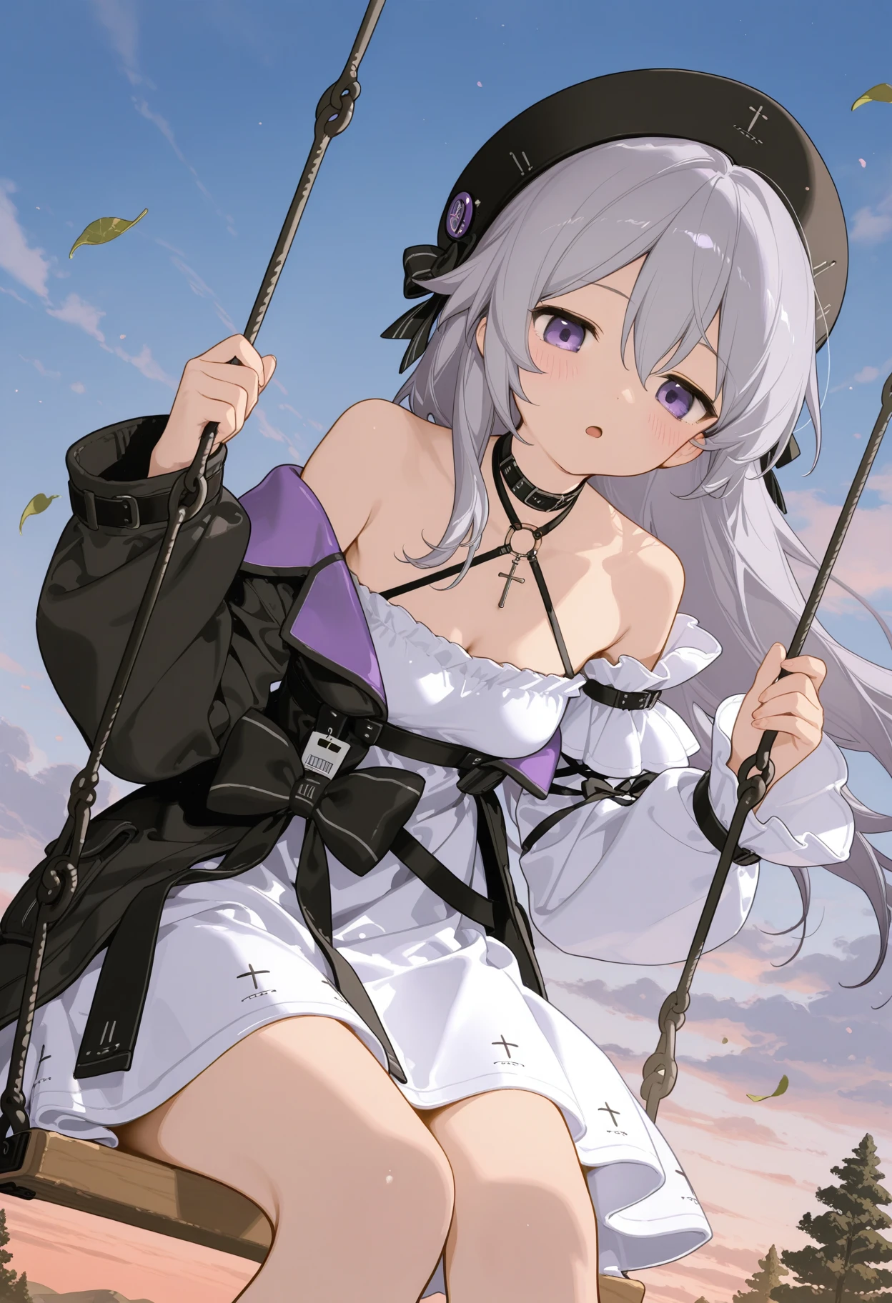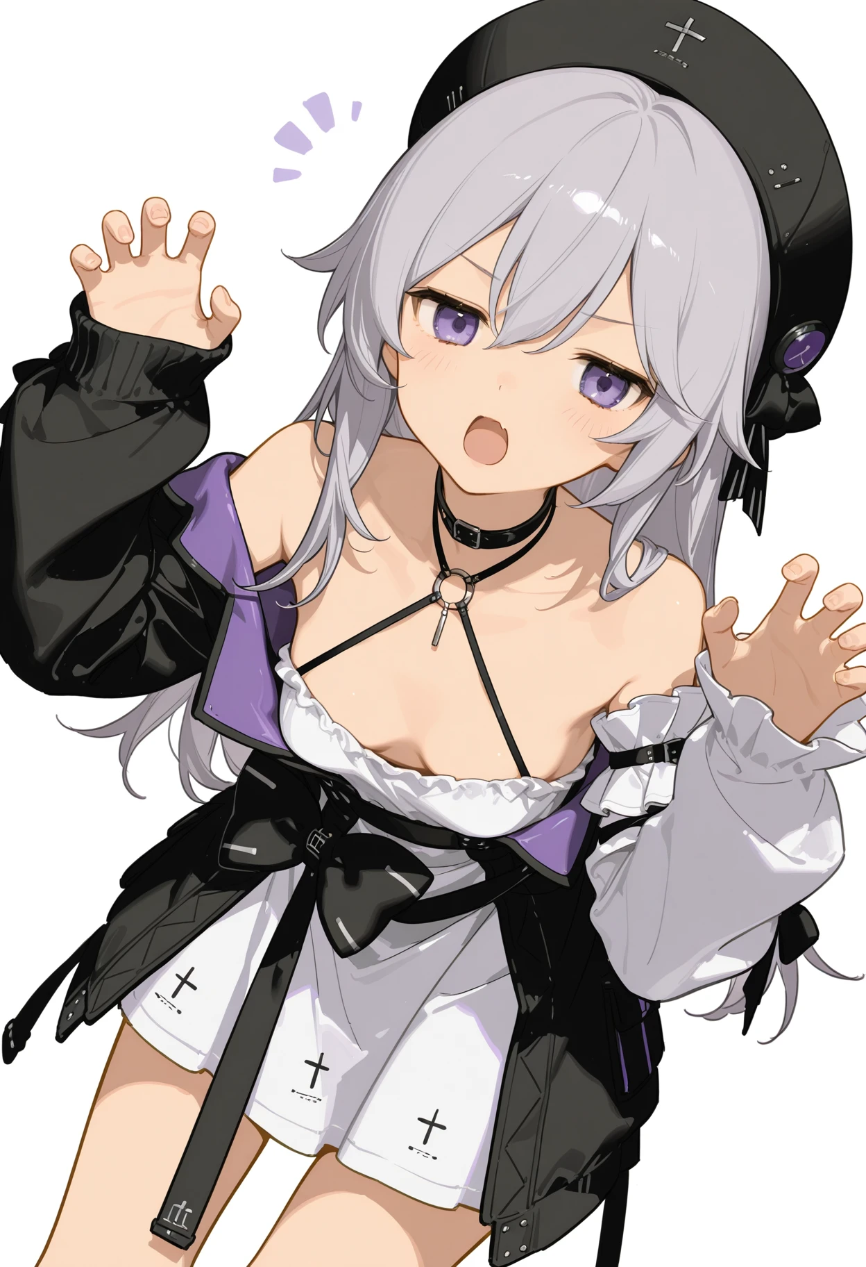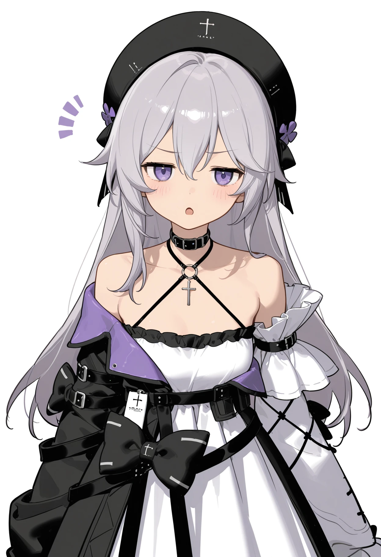 haila, 1girl, solo, grey hair, choker, cross, detached sleeves, hair between eyes, black hat, long hair, long sleeves, purple eyes, beret, white dress, shoulders, asymmetrical sleeves, jacket, sleeves past wrists, black bow, small_, black socksps:海拉宝宝可爱滴捏,没人做lora只能自己来做了。发了几张例图但只有一张展示出来了,c站这审核也是给我整无语了...
