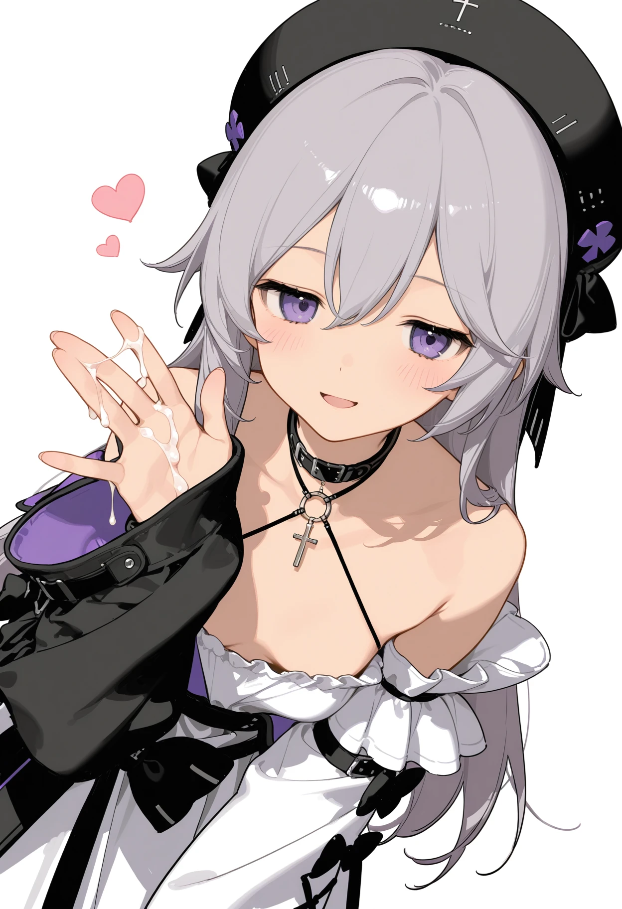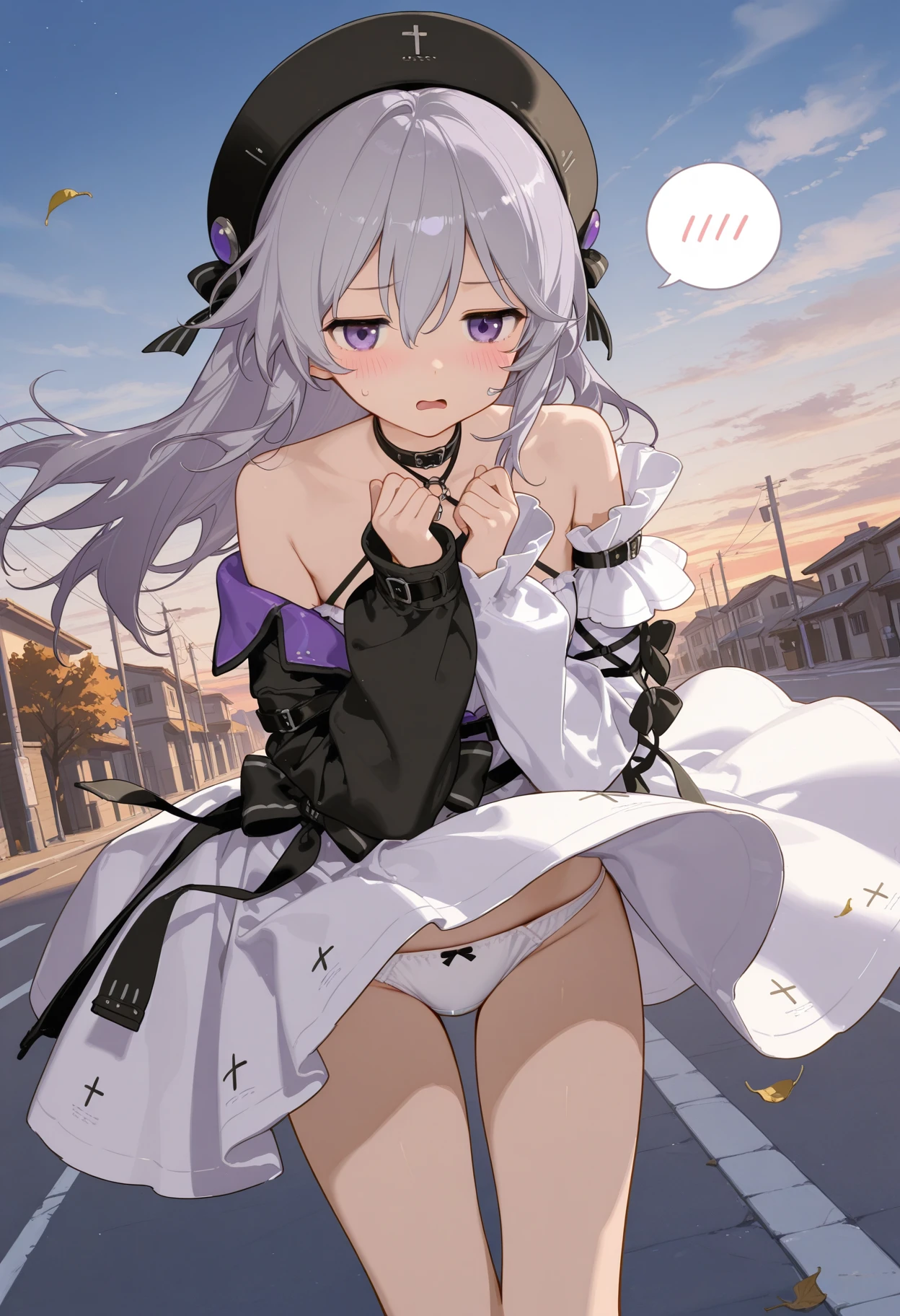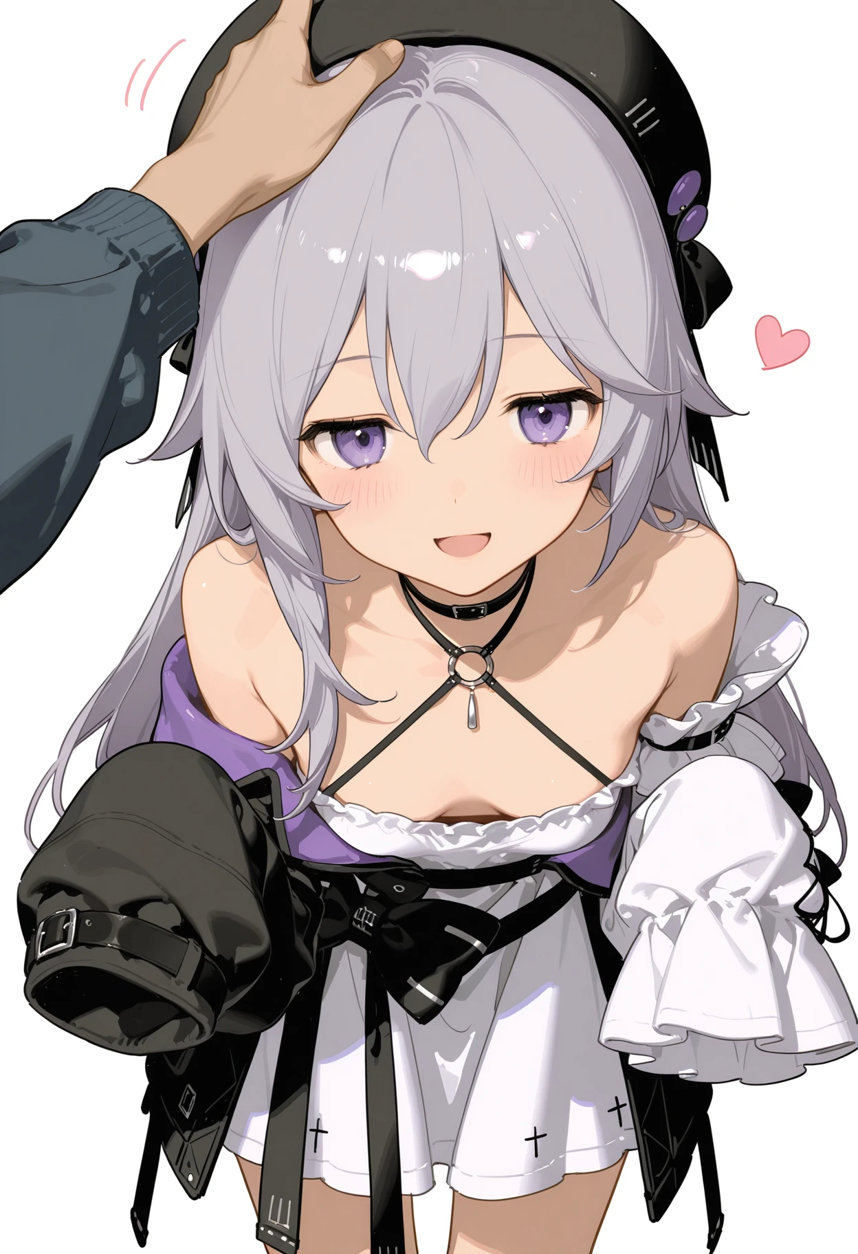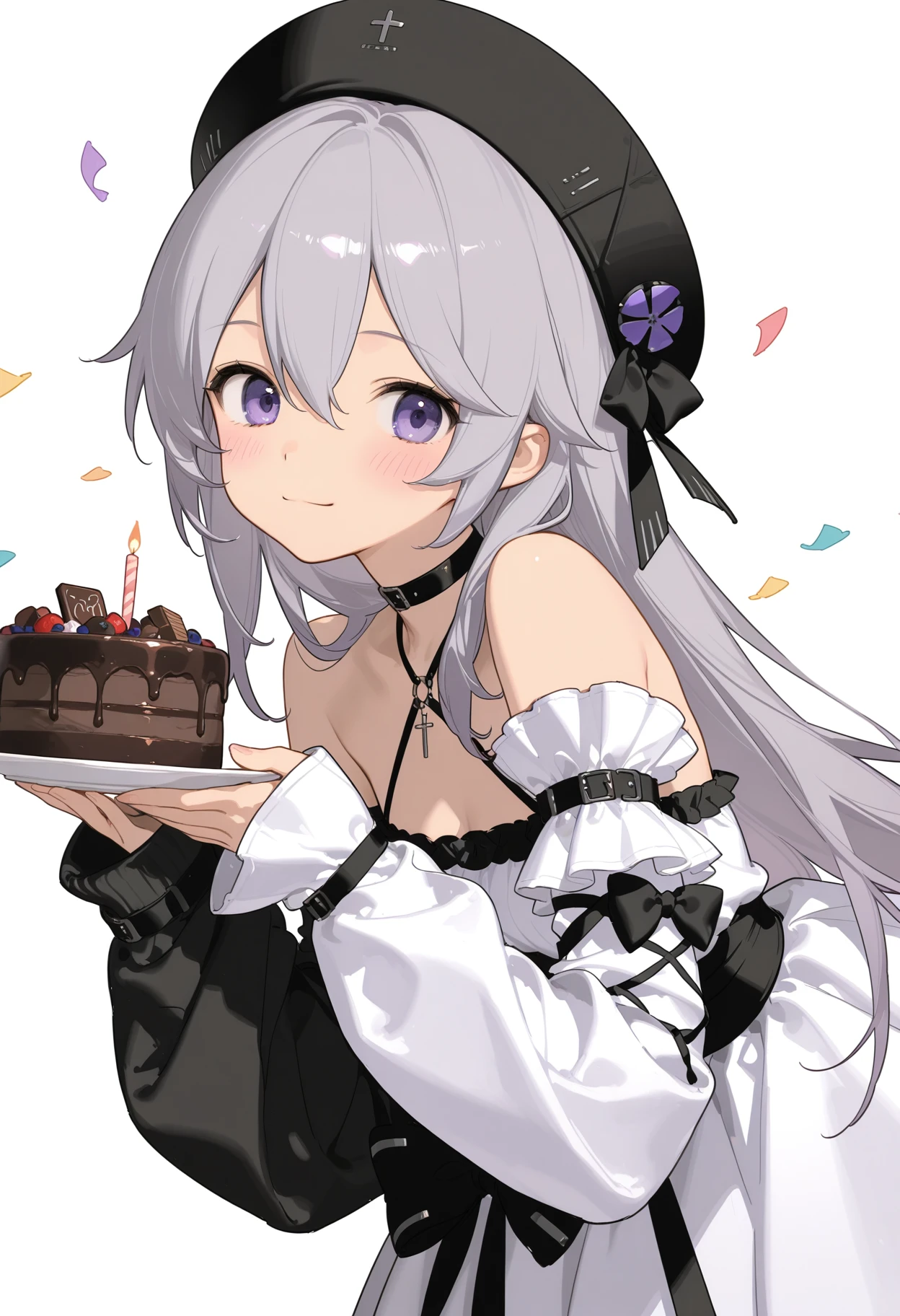 haila, 1girl, solo, grey hair, choker, cross, detached sleeves, hair between eyes, black hat, long hair, long sleeves, purple eyes, beret, white dress, shoulders, asymmetrical sleeves, jacket, sleeves past wrists, black bow, small_, black socksps:海拉宝宝可爱滴捏,没人做lora只能自己来做了。发了几张例图但只有一张展示出来了,c站这审核也是给我整无语了...
