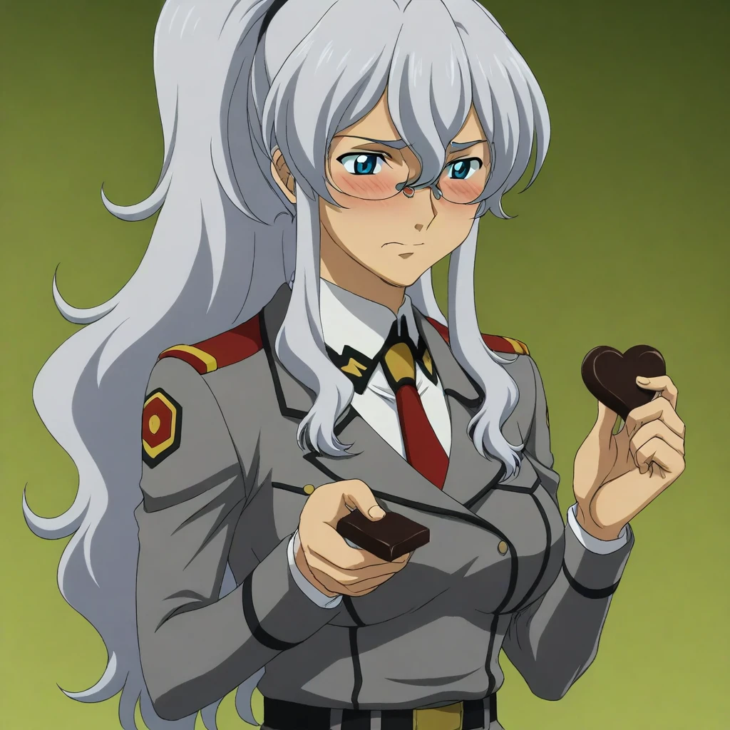 chall acustica \(gundam\), silver hair, long hair, hair between eyes, sidelocks, blue eyes, eyeglasses, hairband, ponytail, collar, necktie, military uniform, white undershirt, belt, skirt, pants, heels, , 1girl, solo