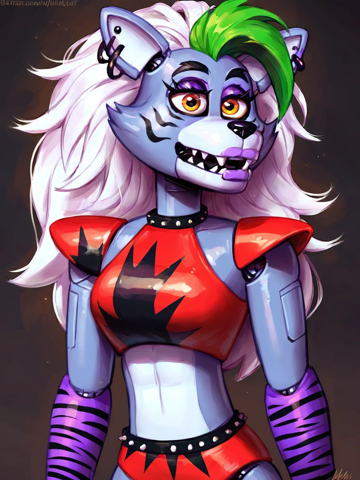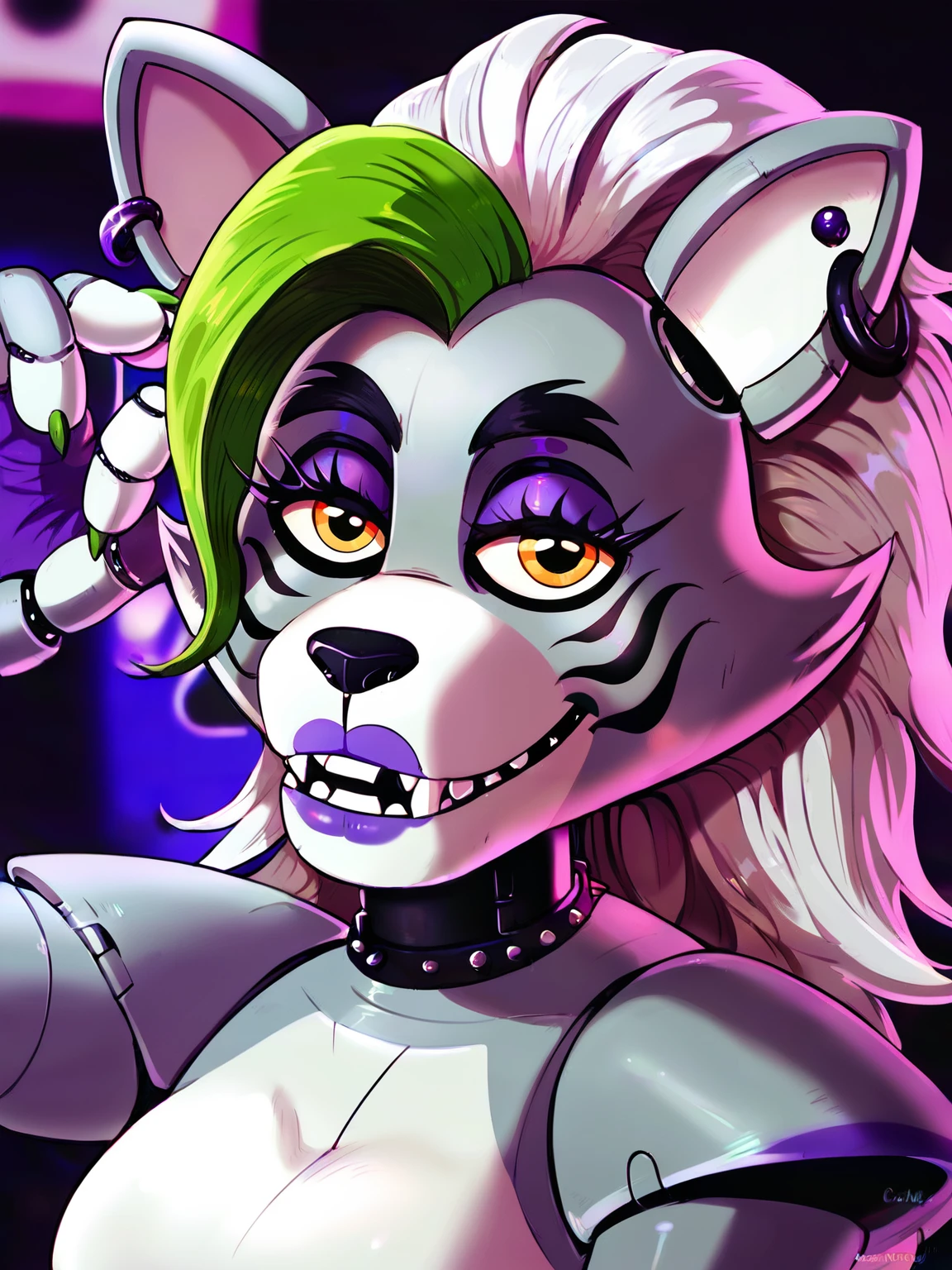 Recommend prompt: "ro_xy, 1girl, animatronic wolf, gray skin, bright yellow eyes, purple lipstick, long and silver hair with green streak, piercing in the ears"