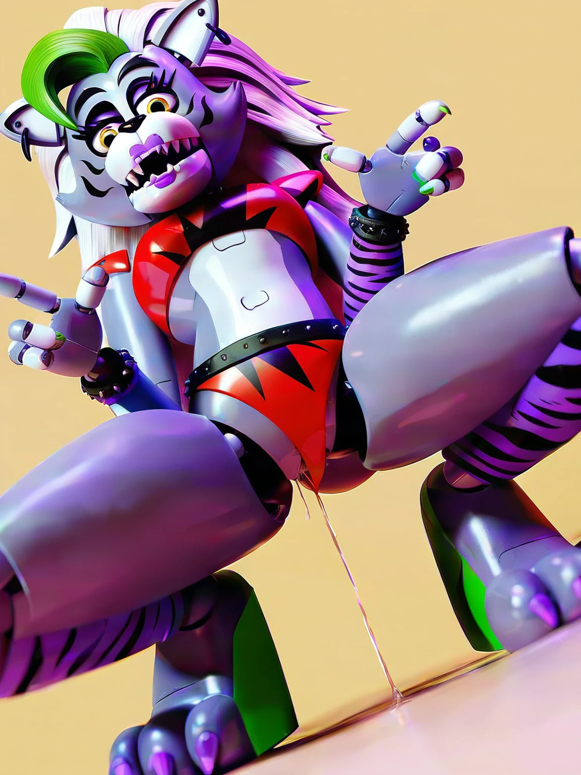 ro_xy, 1girl, animatronic wolf, gray skin, bright yellow eyes, purple lipstick, long and silver hair with green streak, piercing in the ears