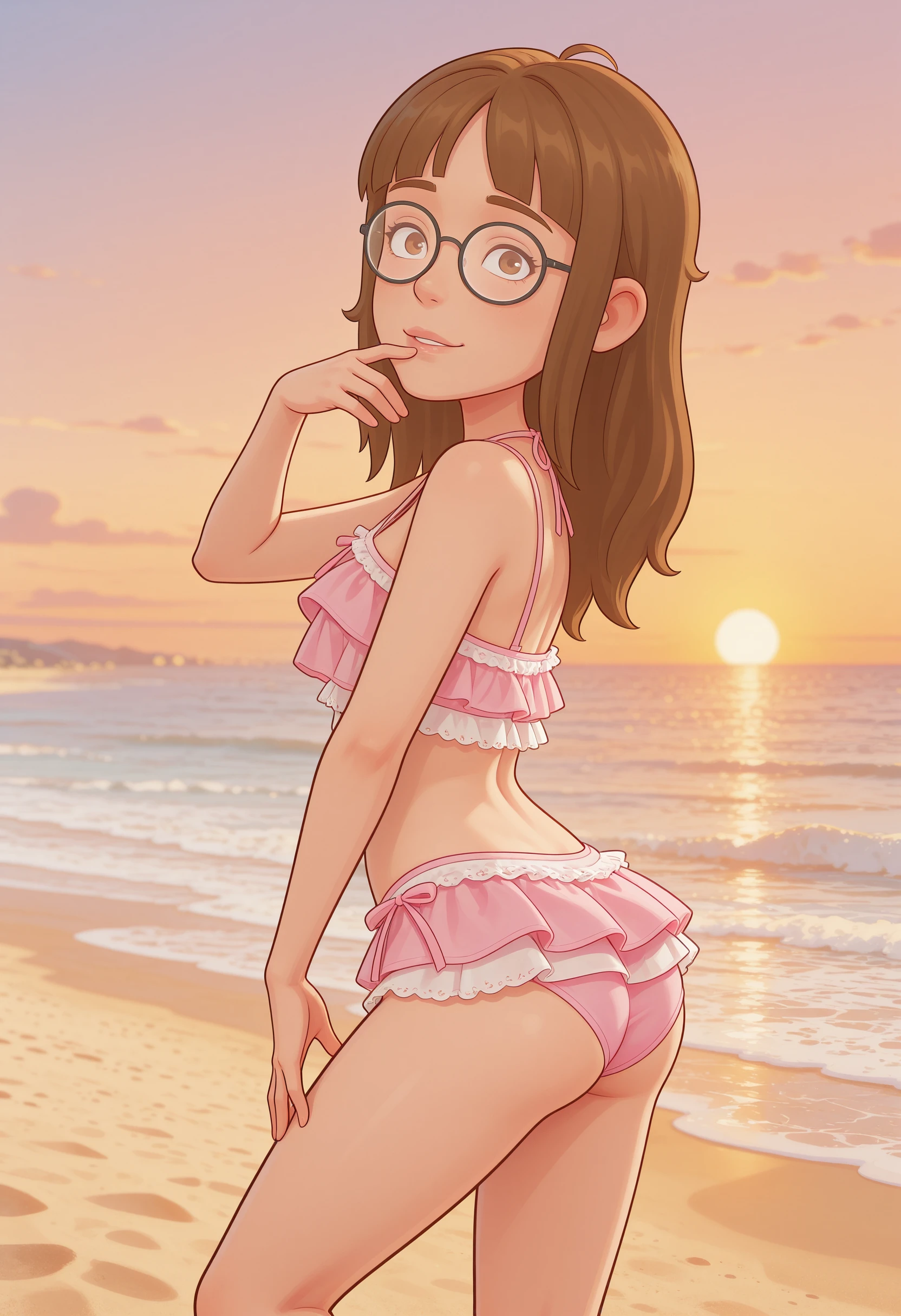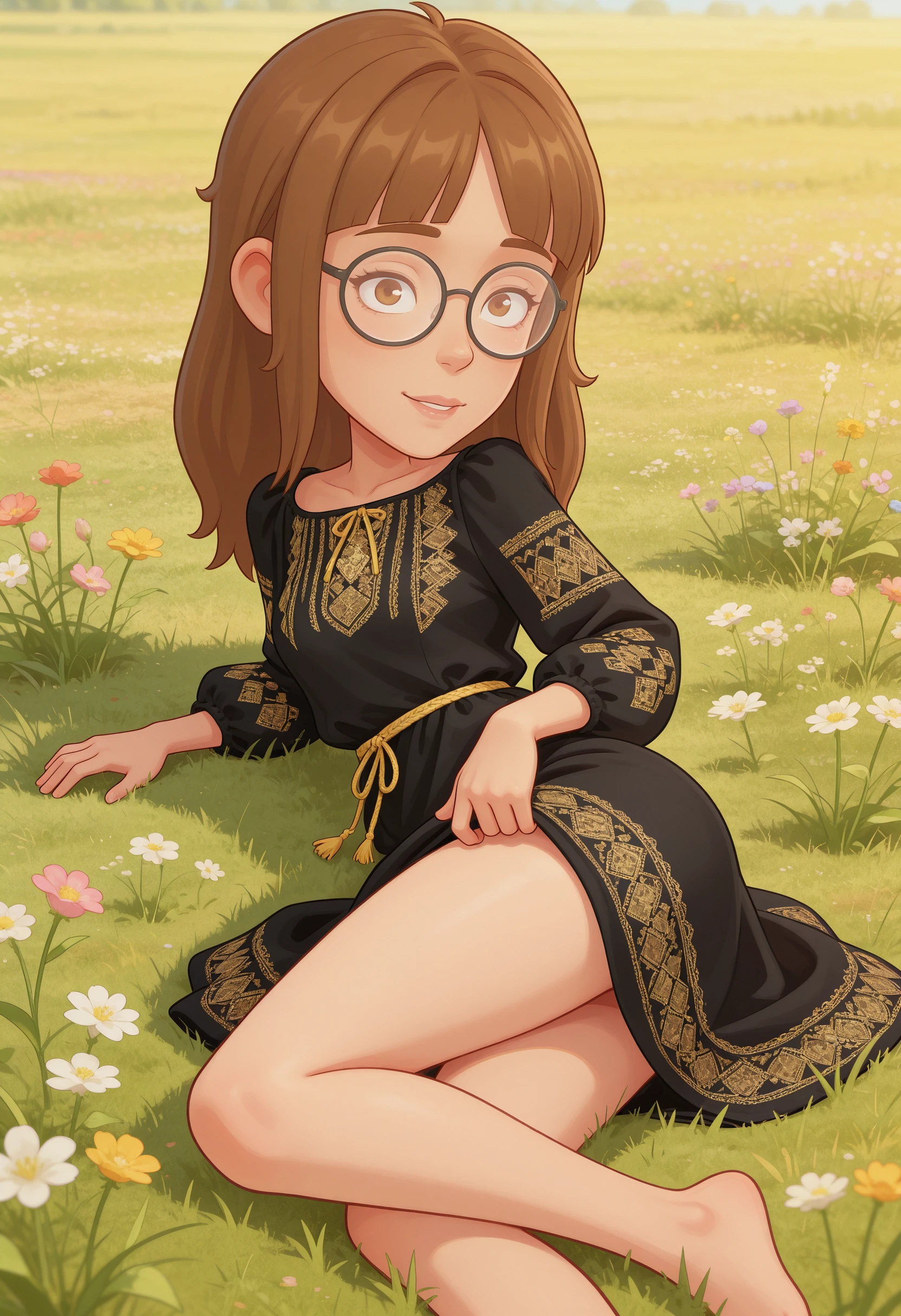 long coat, green sweater, white collared shirt, blue jeans, pendant necklace, ribbon,