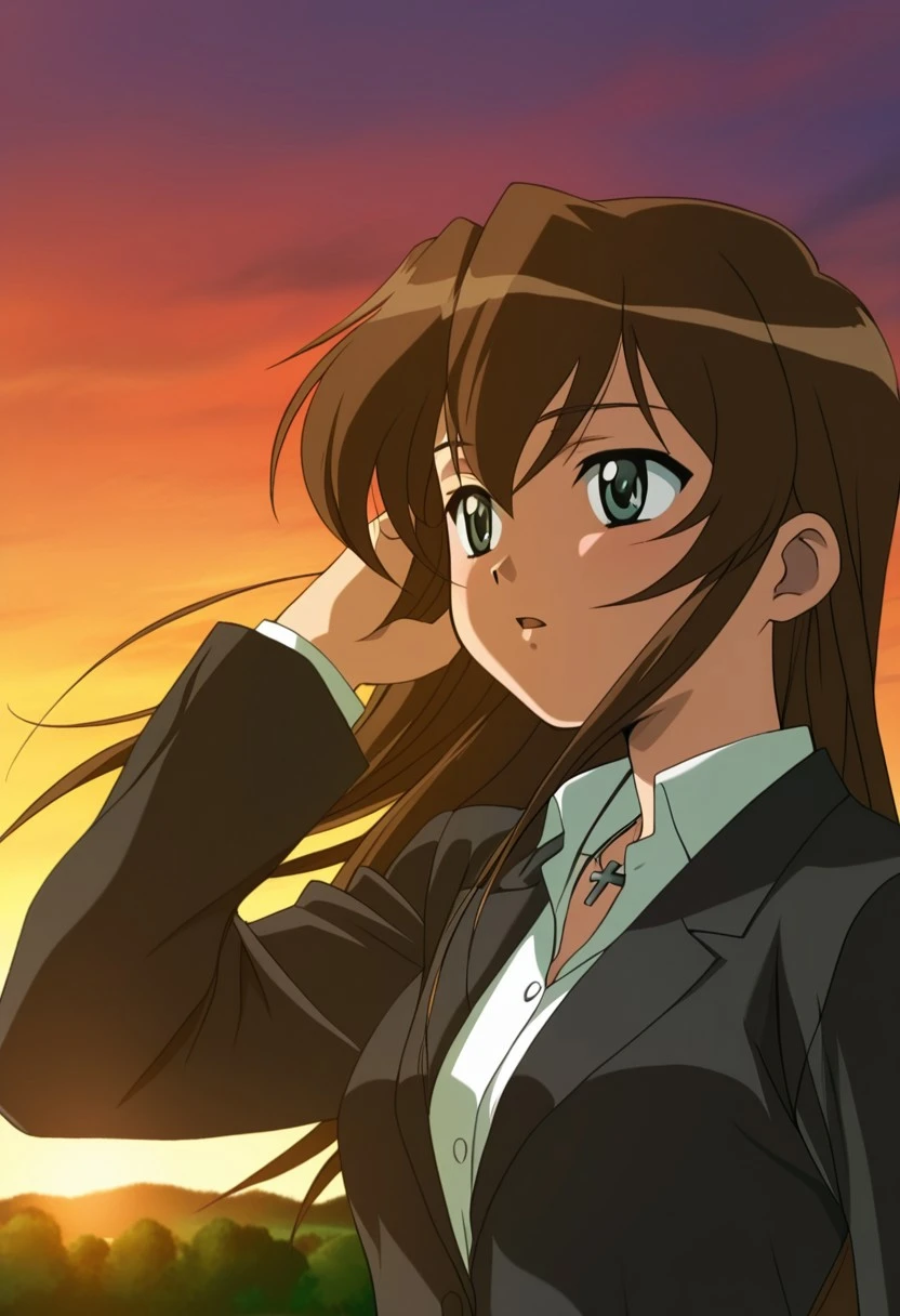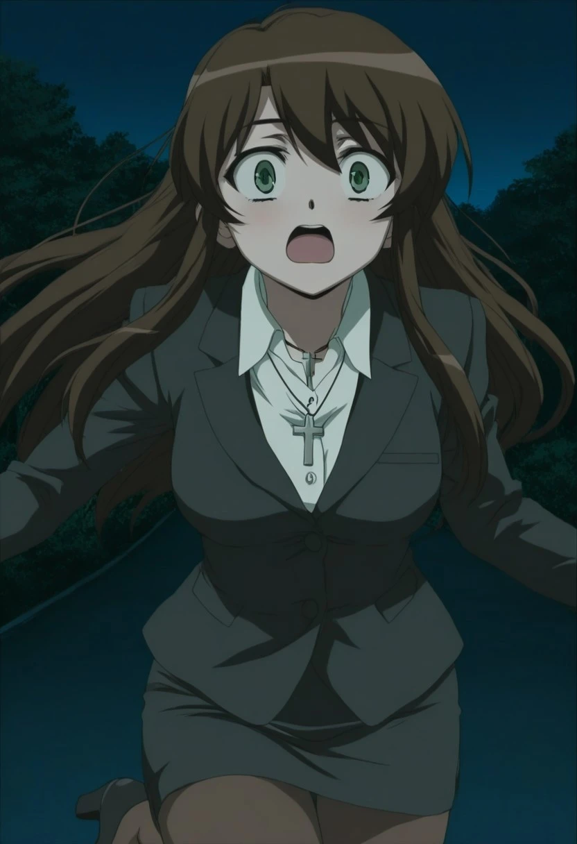 1girl, solo, muted green eyes, cross necklace, brown hair, black skirt suit with white collared shirt, brown thighhighs, black high heels, pantyhose,