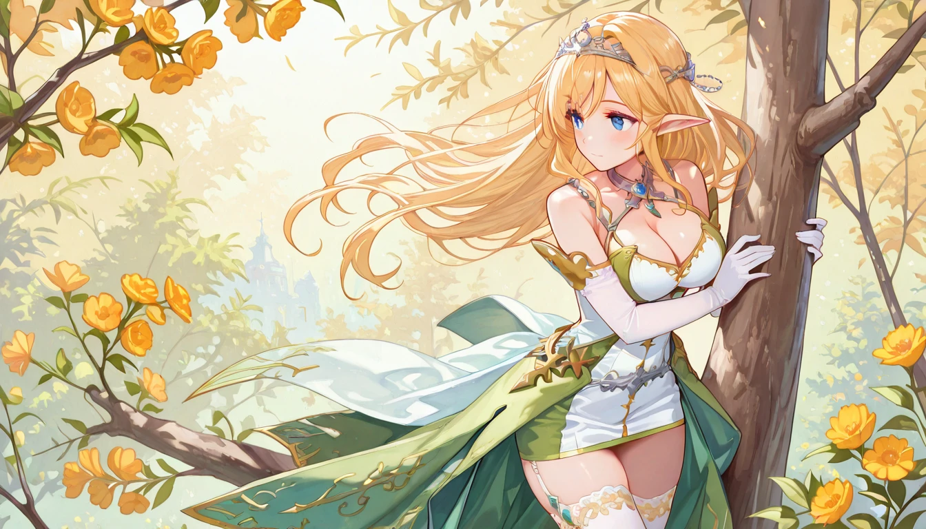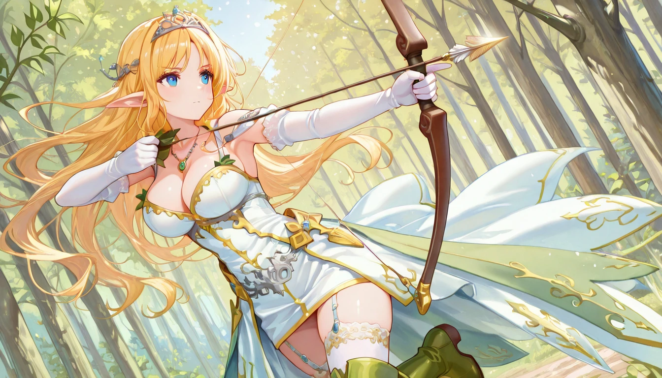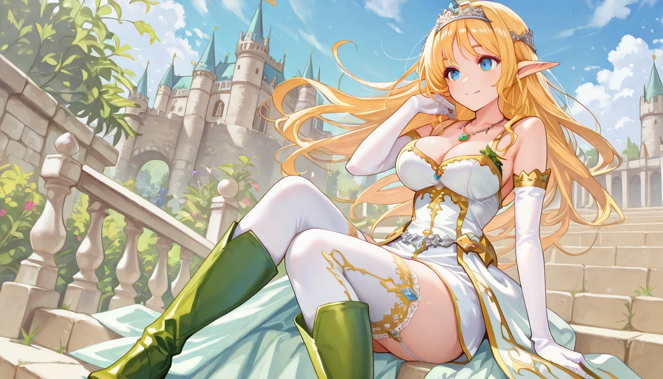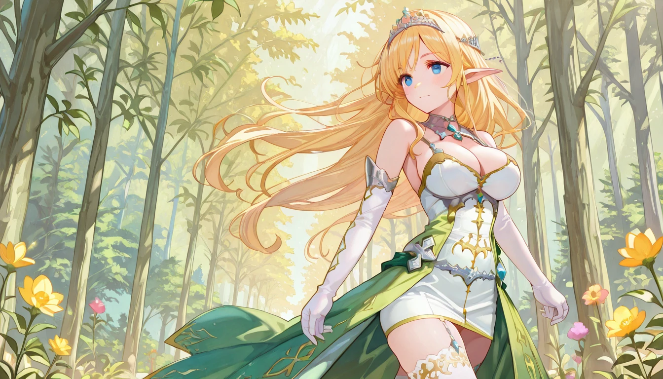 Default: White minidress, cleavage, Green Skirt, white gloves, silver tiara, white stockings, green boots, necklace