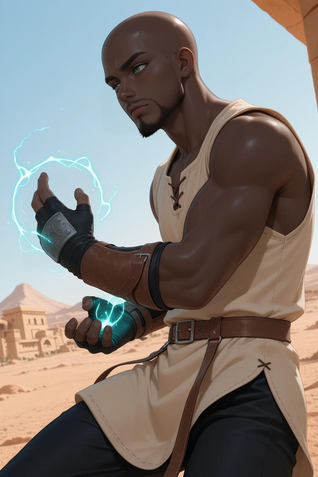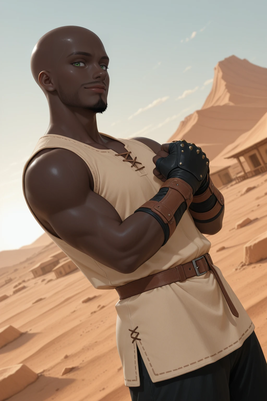 Tan tunic, Sleeveless, brown leather straps, black pants, leather fingerless gauntlets,