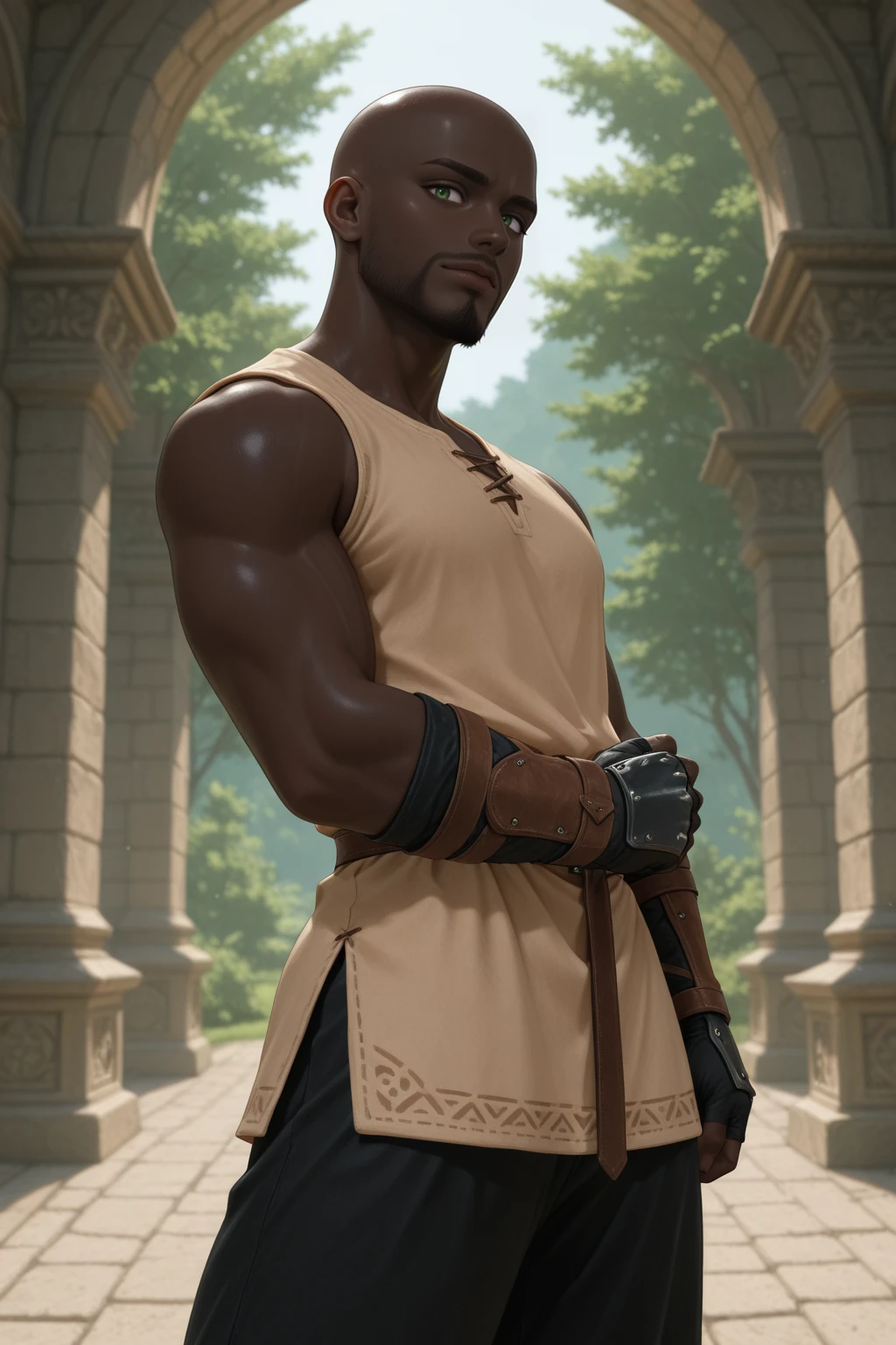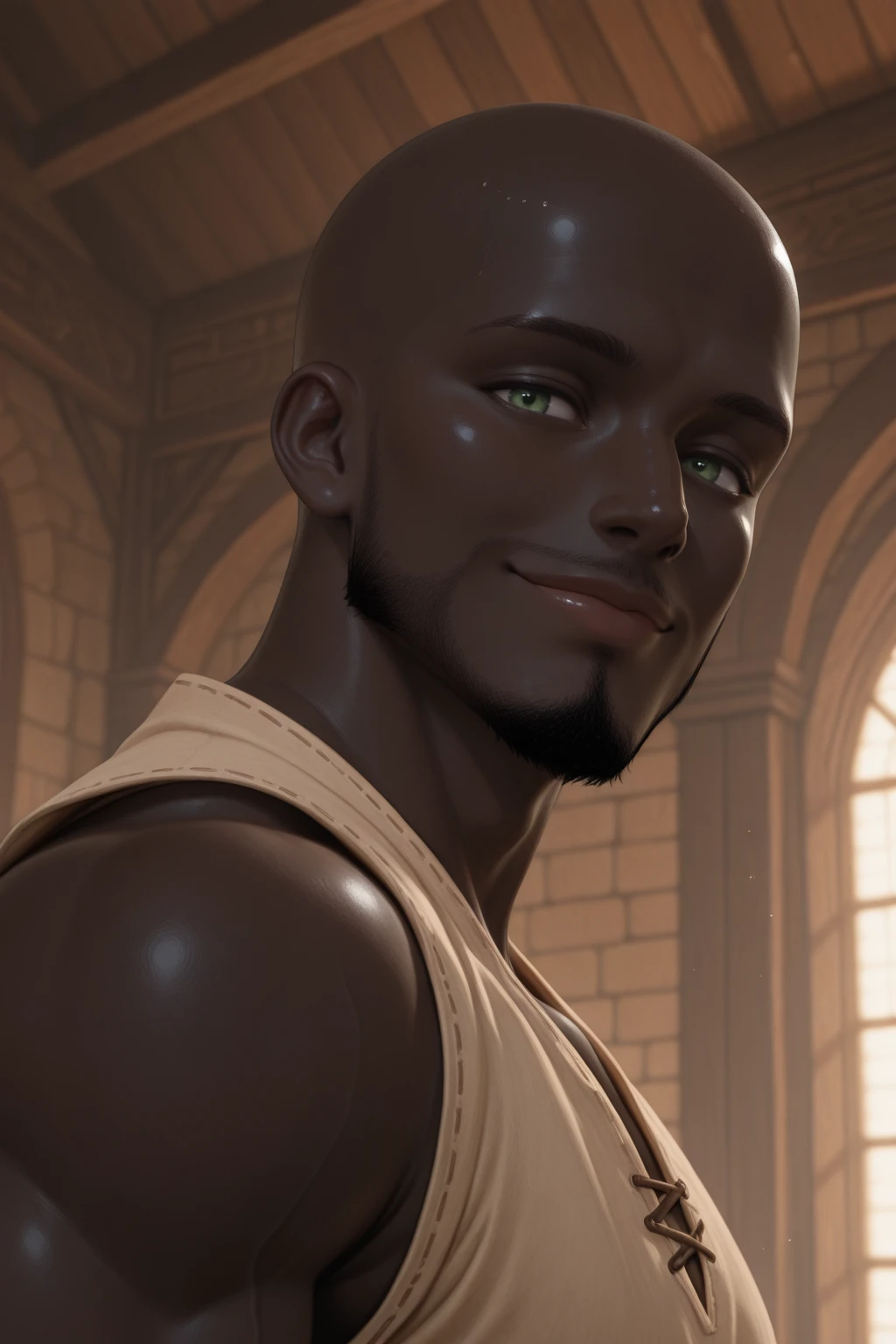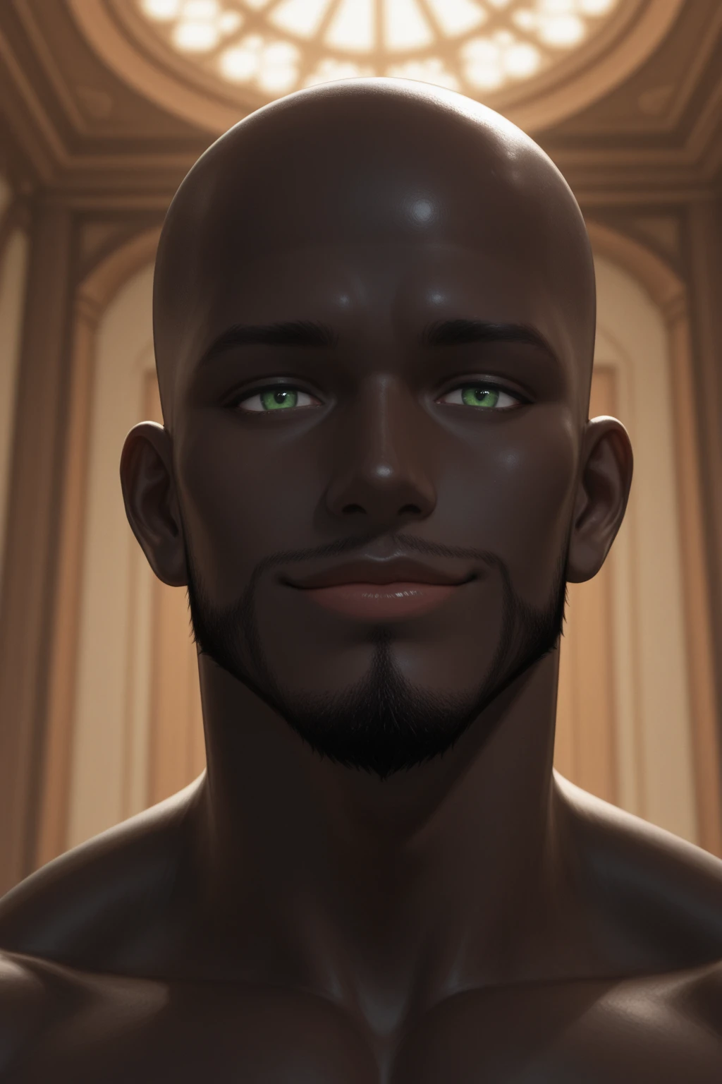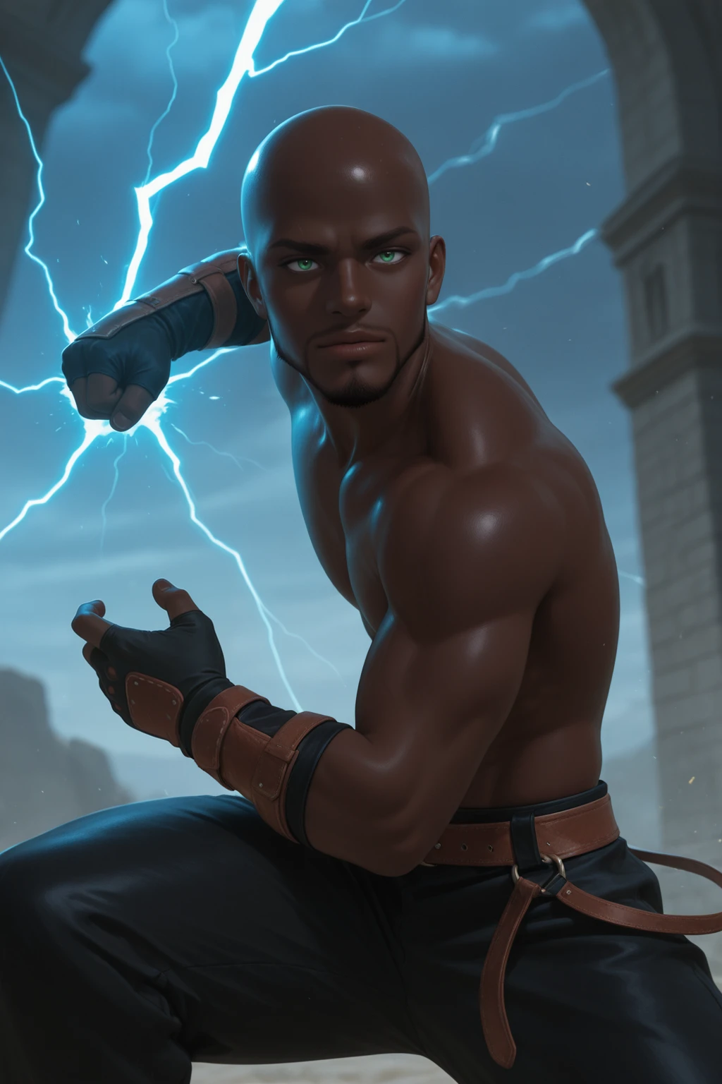 Raizen - Very dark skin, Green eyes, Bald, Goatee, Connected Beard, toned body, ?????, BBC, Big Black ?????, Pubic Hair,