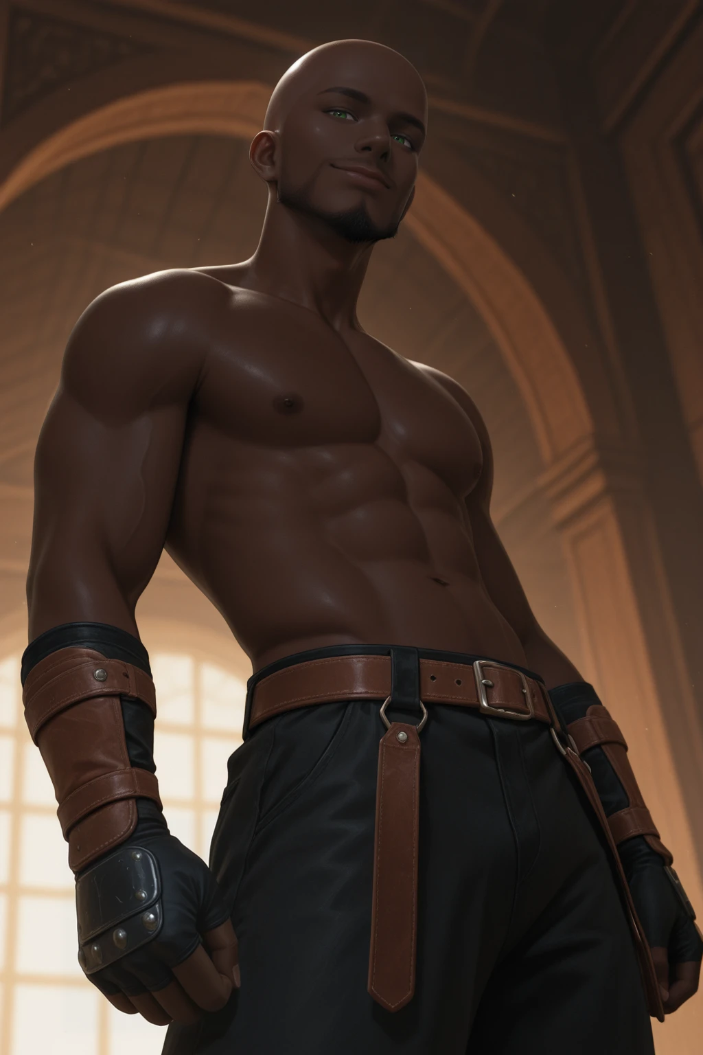 Topless, brown leather straps, black pants, leather fingerless gauntlets,