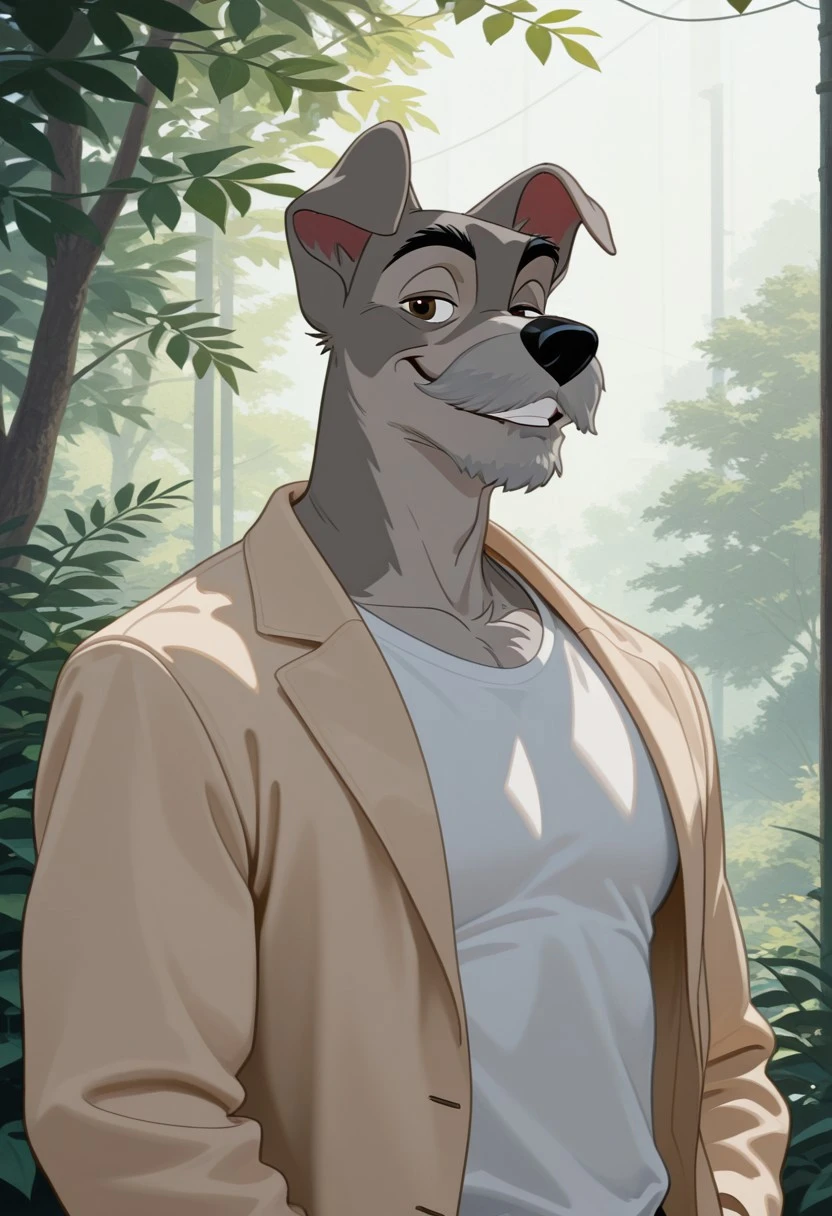 Tr4mp, 1boy, broad shoulders, mature male, brown eyes, anthro, dog, gray fur, two tone body, animal ears, black eyebrows, facial hair, mustache