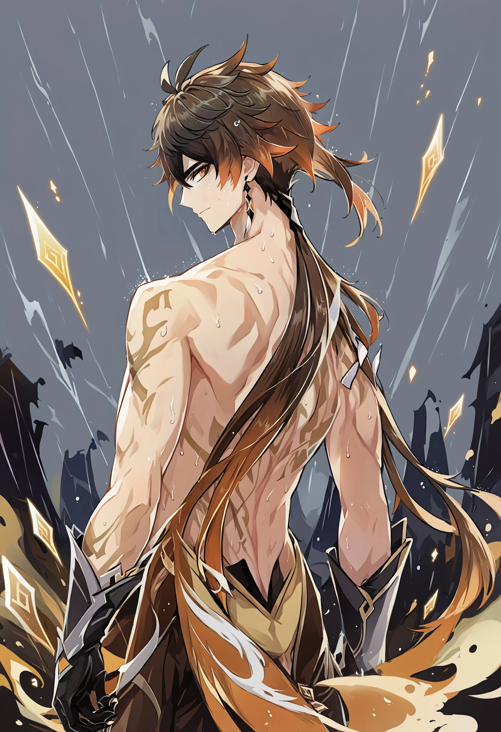 zhongli, 1boy, zhongli \(genshin impact\), brown hair, orange hair, gradient hair, long hair, ponytail, yellow eyes, orange eyes, eyeliner, jacket, tassel earrings