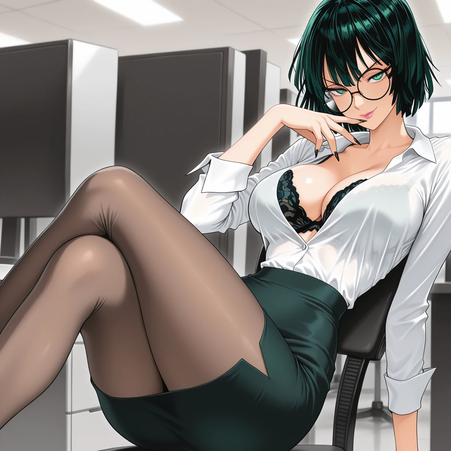 green eyes, green hair, large breasts, wide hips, thin waist, perfect body, eyelashes, lips, bangs, short hair, manga, hatching shadow, sketch,