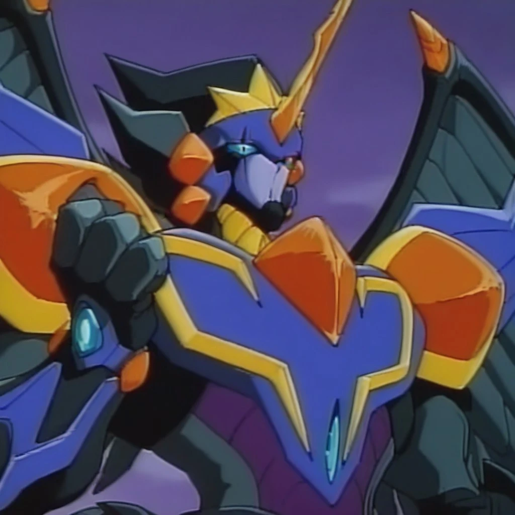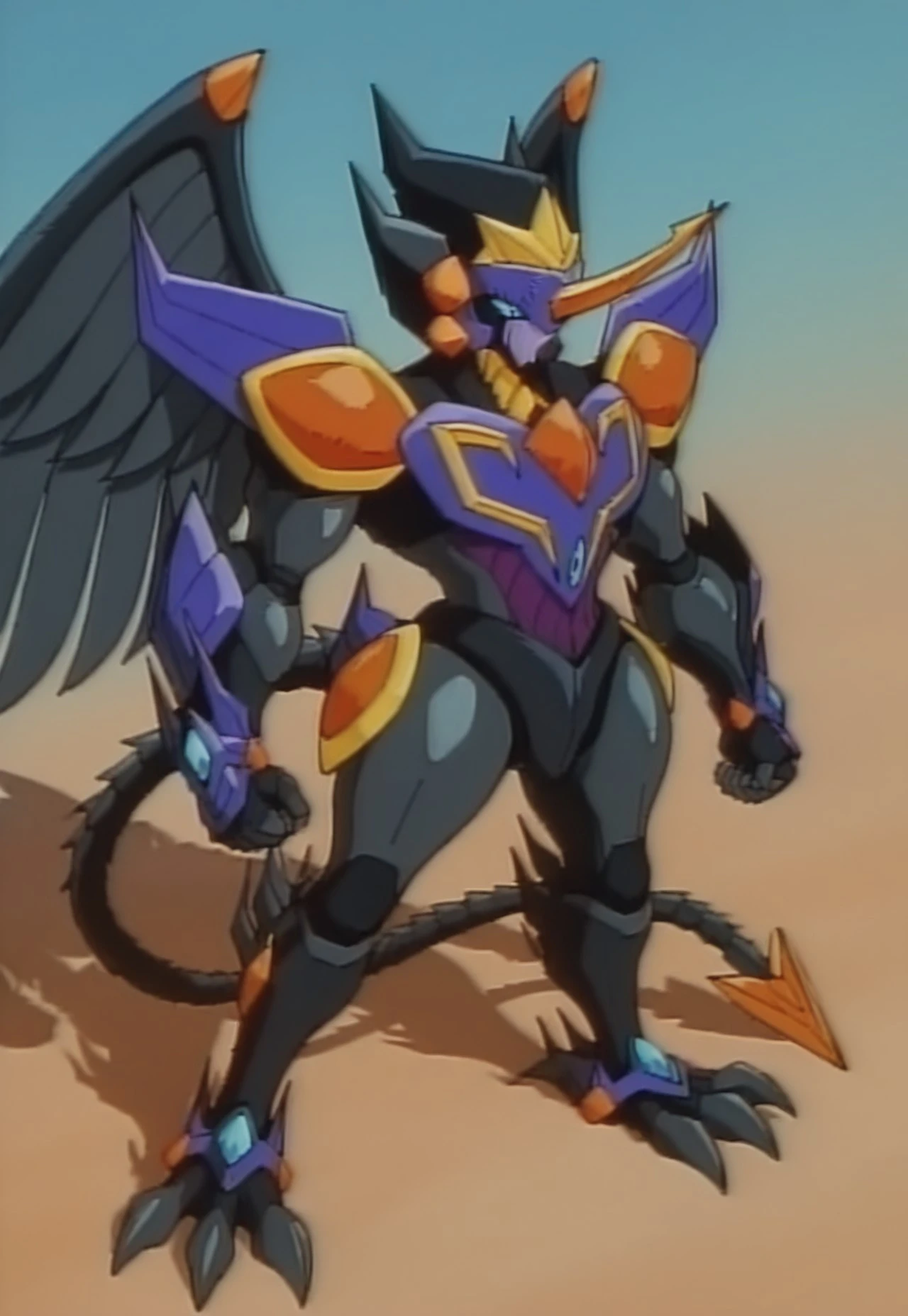 Tags: mecha, robot, big wings, mechanical wings, mechanical tail, spikes, armor, armored body, slit pupils, golden horn, multicolored body, single horn, purple face, blue sclera, talons