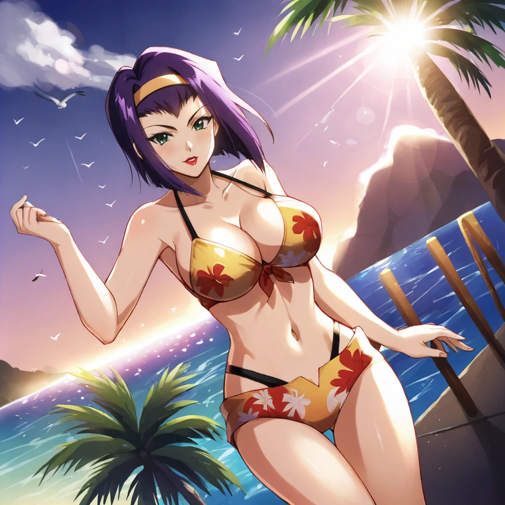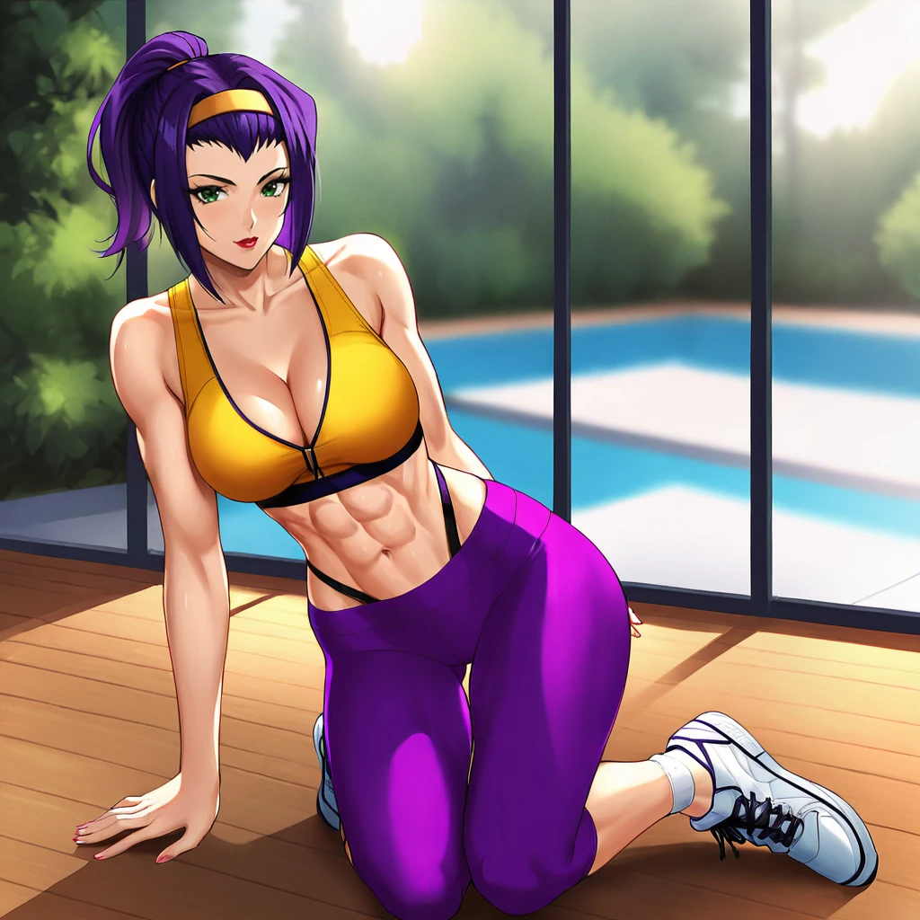 Trigger : Faye, 1girl, solo, purple hair, green eyes, thighhighs, yellow shorts, hairband, lipstick, short hair, midriff, retro artstyle, makeup, cowboy shot