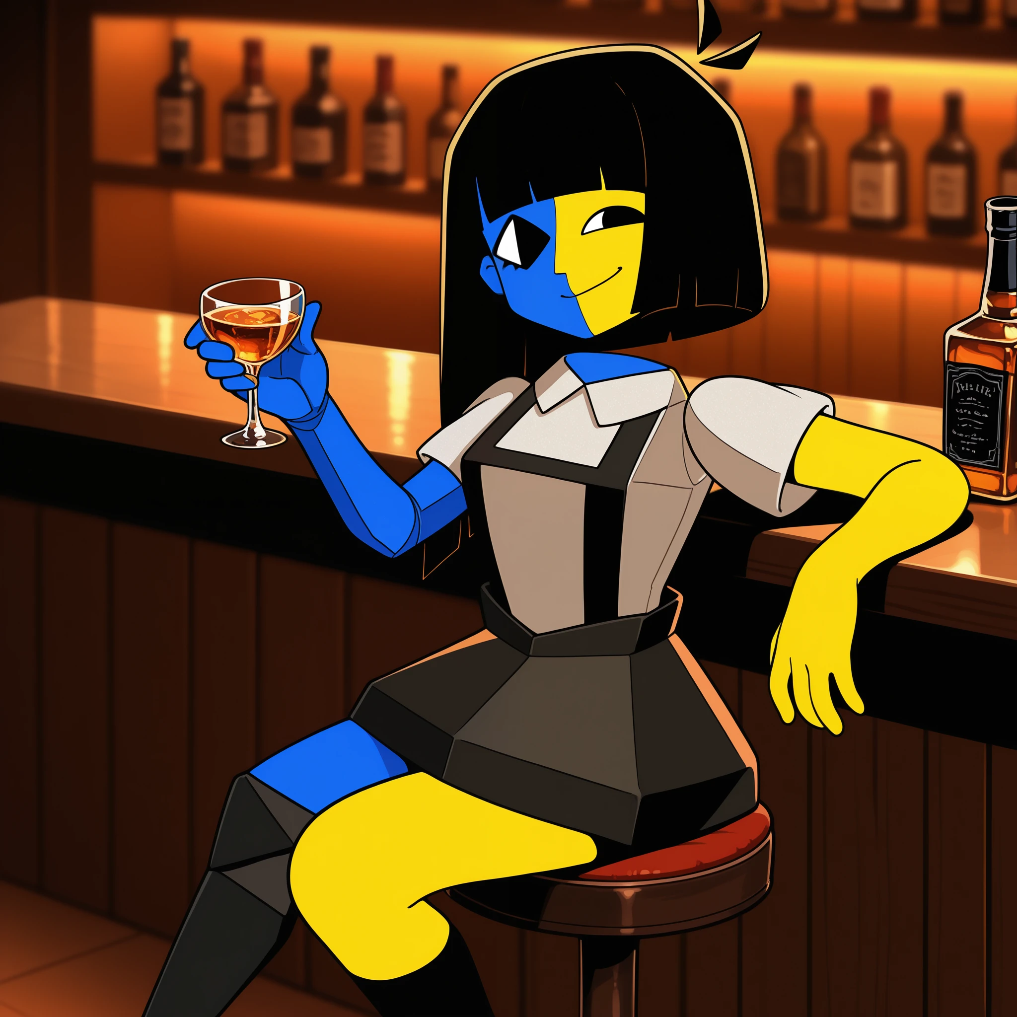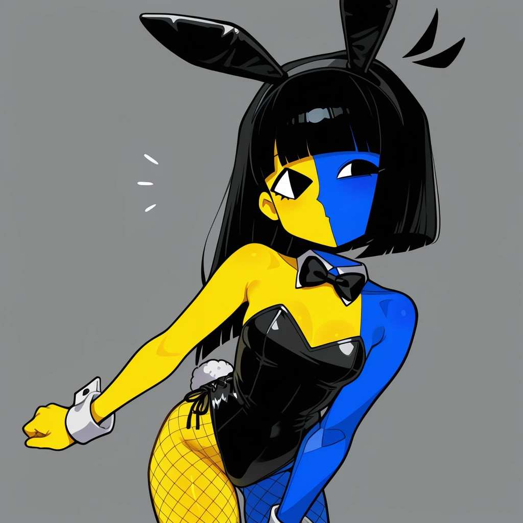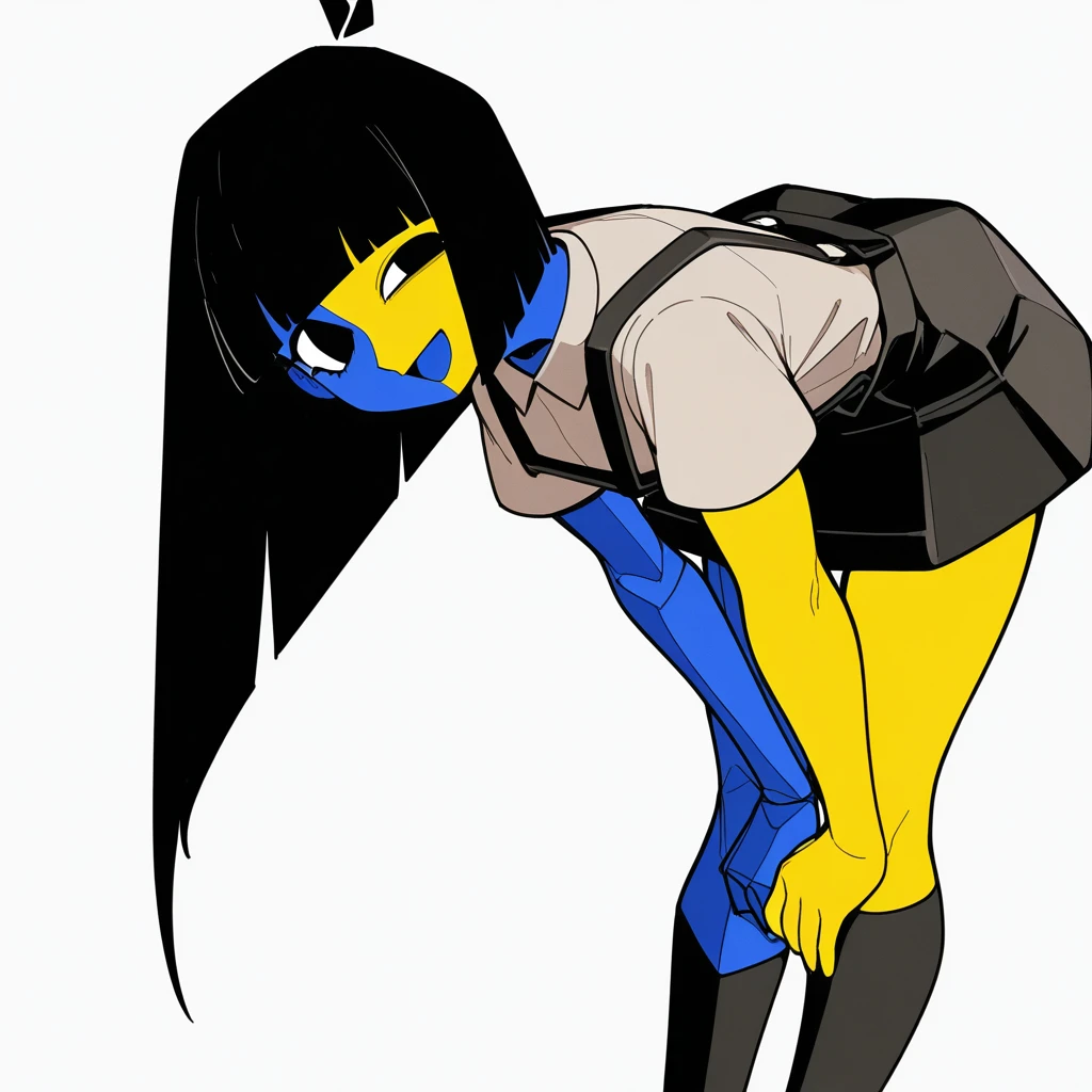 Appearance: 1girl, uneven eyes, floating head, disembodied head, antenna hair, black hair, bob cut, blunt bangs, long hair, black eyes, split-color skin, two-tone skin, colored skin, yellow skin, blue skin