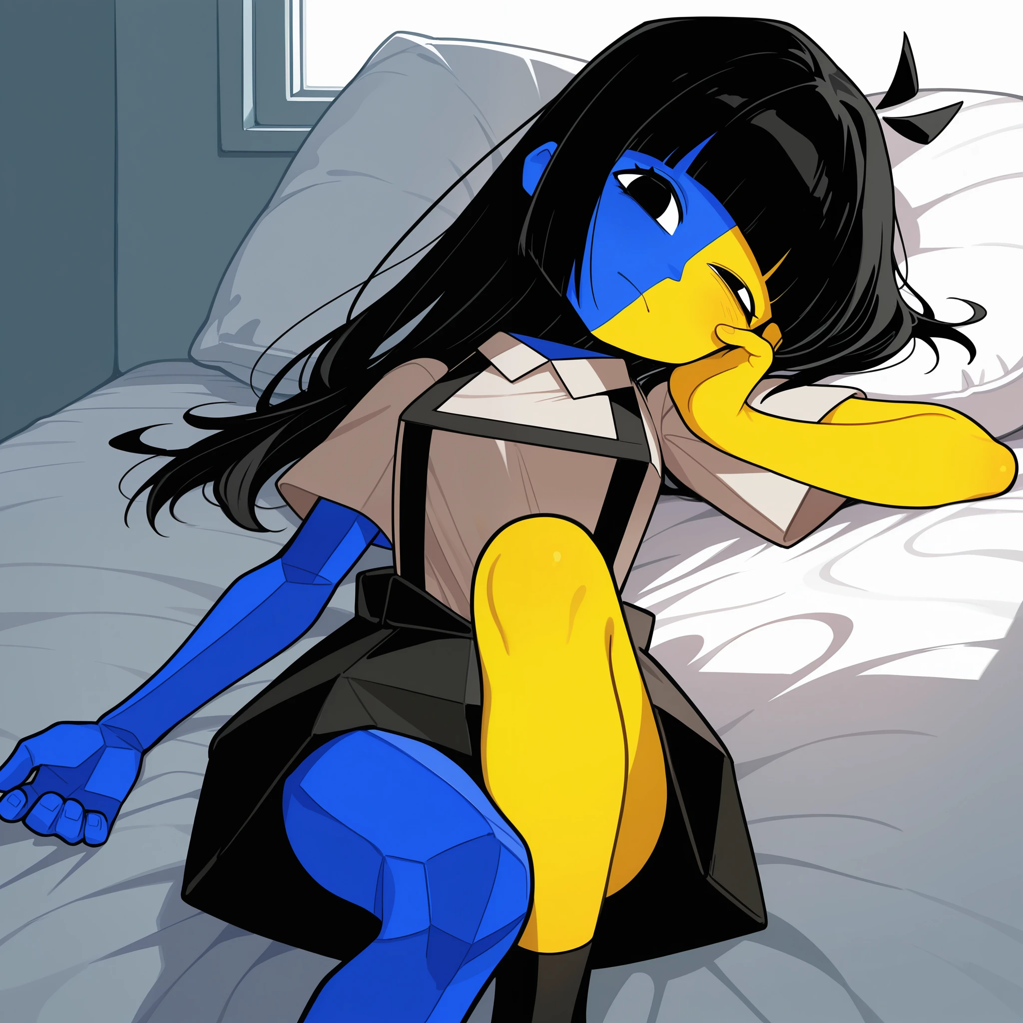 1girl, uneven eyes, floating head, disembodied head, antenna hair, black hair, bob cut, blunt bangs, long hair, black eyes, split-color skin, two-tone skin, colored skin, yellow skin, blue skin