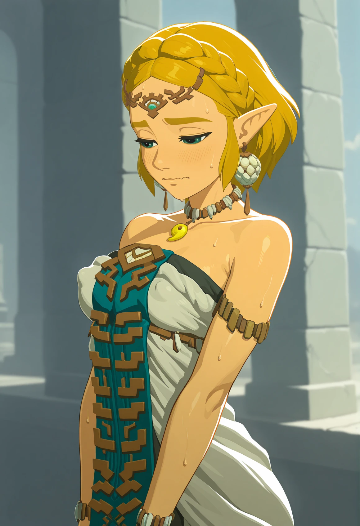 1girl, princess zelda, blonde hair, pointy ears, totk, short hair, forehead jewel ,magatama necklace, earrings, bare shoulders, white dress