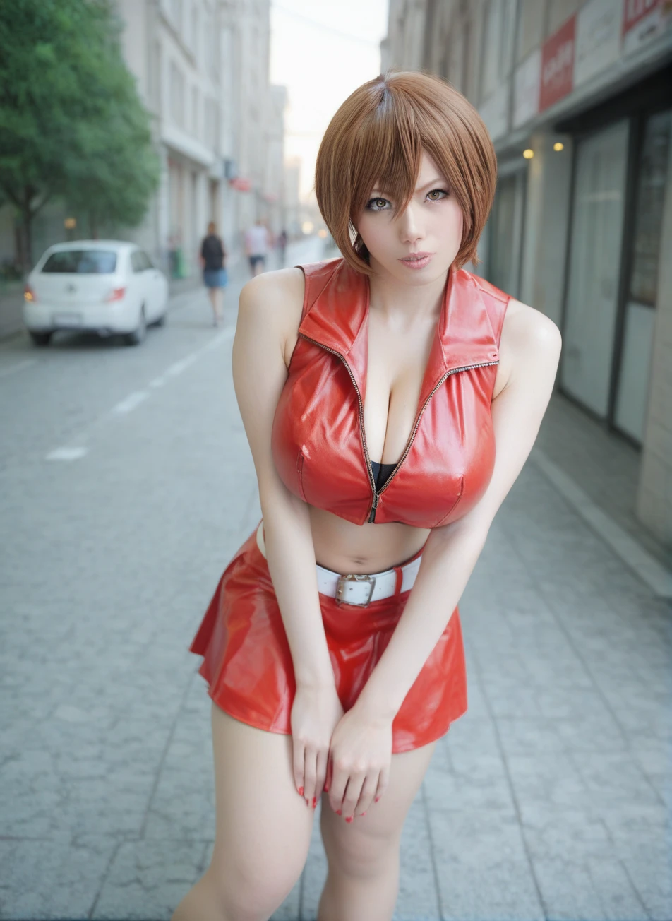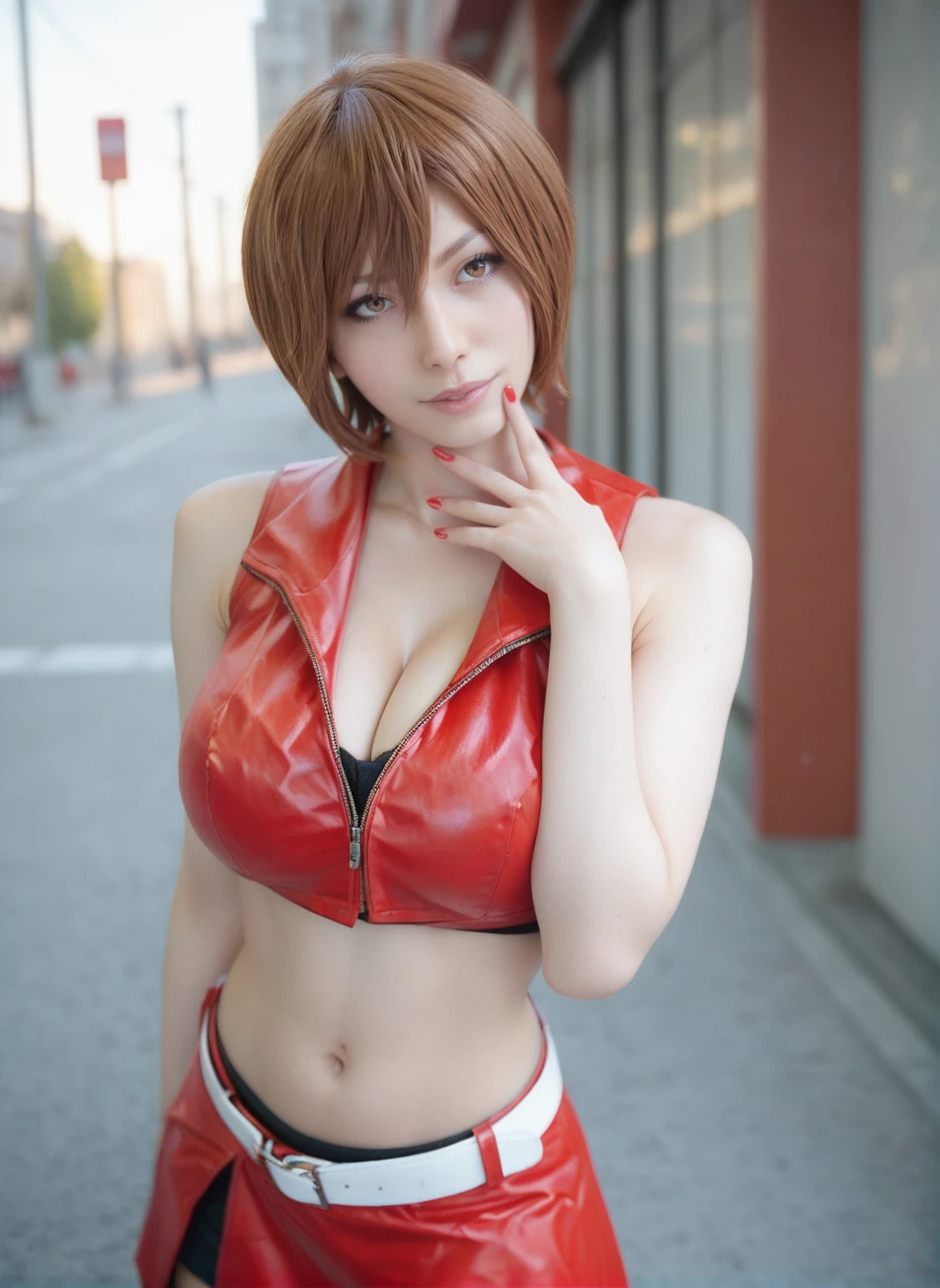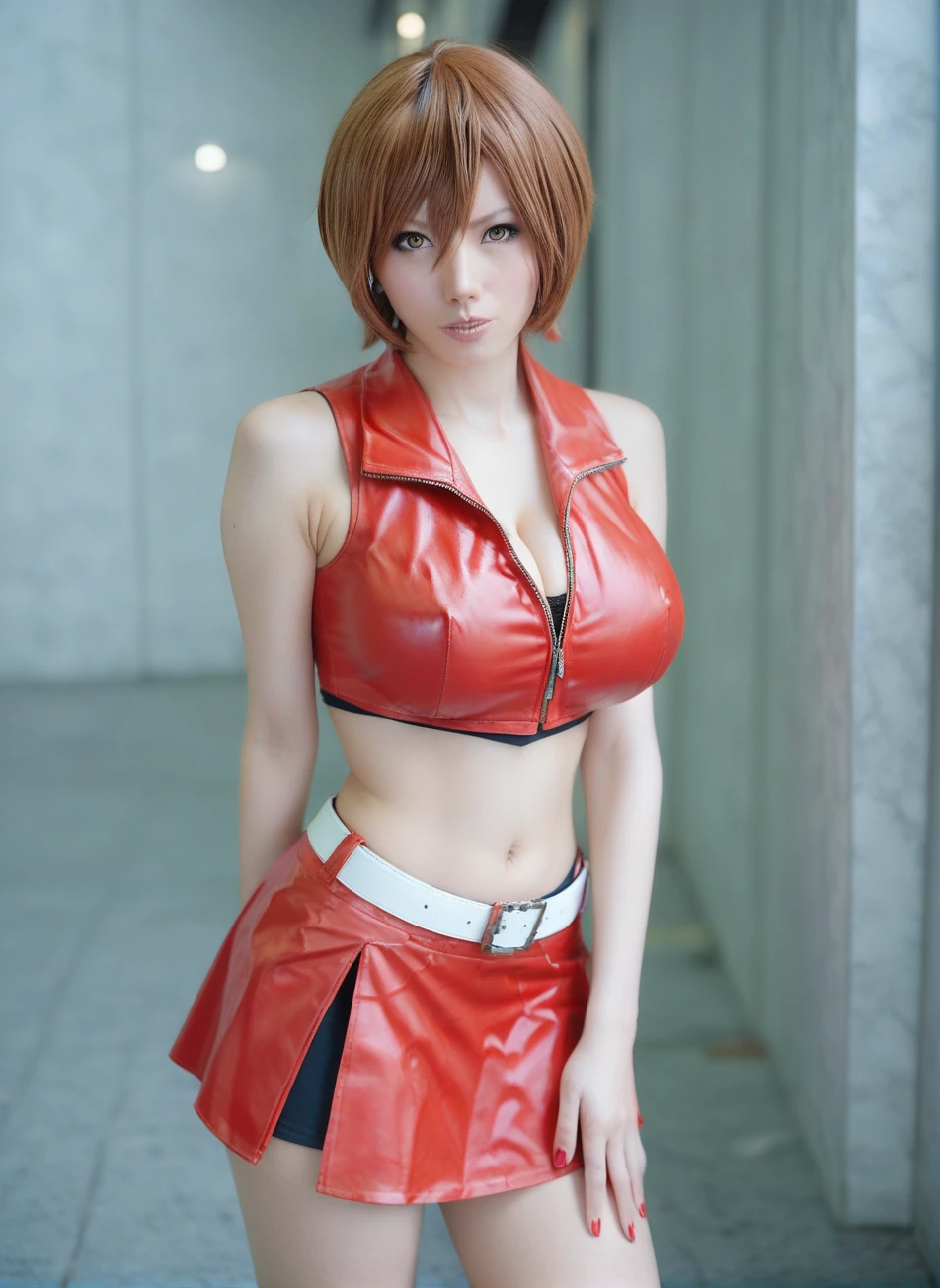 short hair, red skirt, crop top, midrift