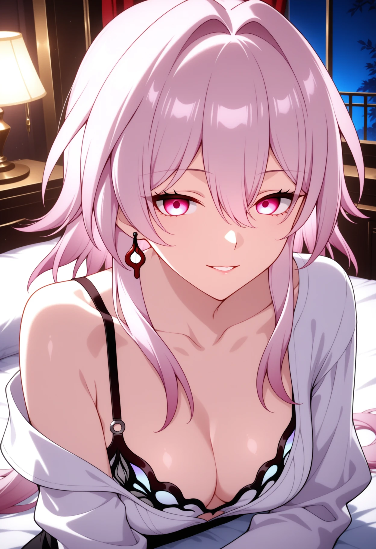 Evernight, 1girl, solo, gloves, black gloves, looking at viewer, pink eyes, sitting, earrings, long sleeves, jewelry, flower, closed mouth, breasts, hairclip, hair between eyes, single bare shoulder, white shirt, shirt, thighs, dress, frills, very long hair, black jacket, simple background, blush, jacket, between legs,thin lines