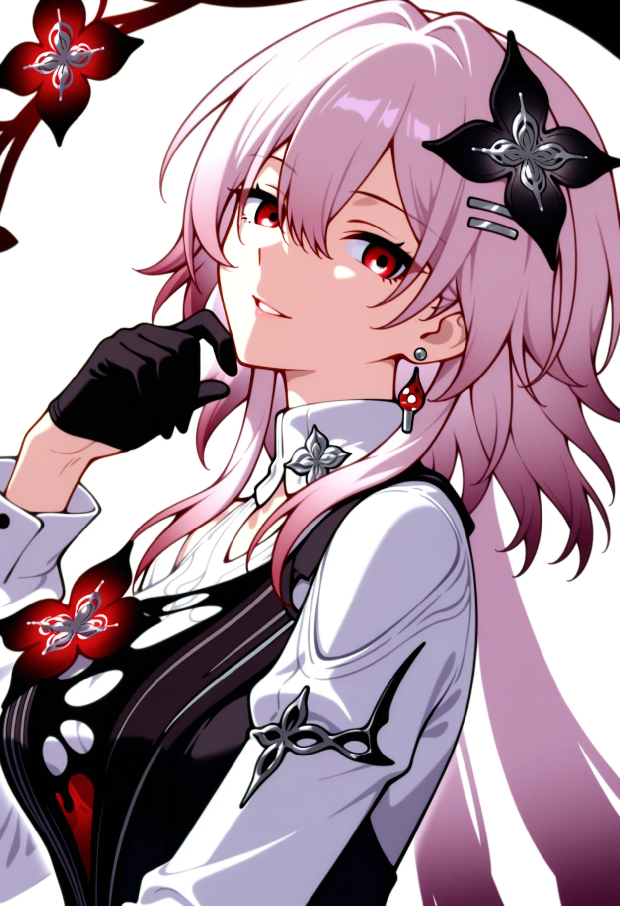 Evernight, 1girl, solo, looking at viewer, jewelry, earrings, smile, upper body, flower, long sleeves, breasts, hair between eyes, hairclip, shirt, parted lips, white shirt,white background,black gloves