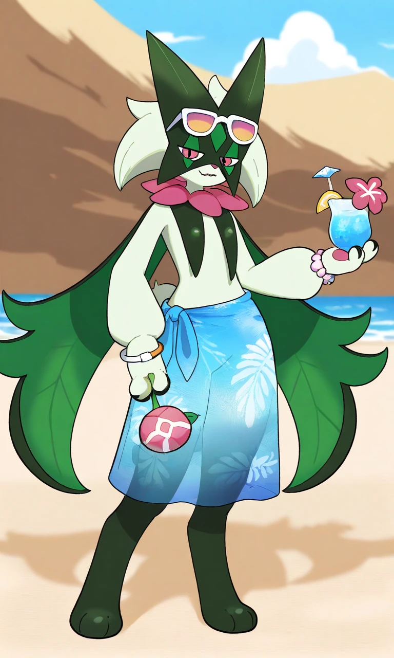A very sexy woman in beachwear holding a flower in front of a beach background, hairy woman, masterpiece, high quality, flat chest, alone, 1 girl, MeowXL, meowscarada, Pokemon (creature), alone, red eyes, hairy, sunglasses, smile, glasses on head, holding