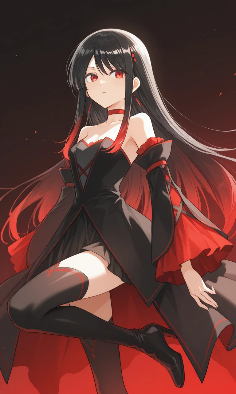 Meccha_Ariya, black hair, long hair, straight hair, gradient hair to red, swept bangs, red eyes, red choker, hair ornament, sidelocks, gradient hair sidelocks, strapless dress, black dress, detached sleeves, miniskirt, showgirl skirt, black thighhighs, high heels, black high heel boots,
