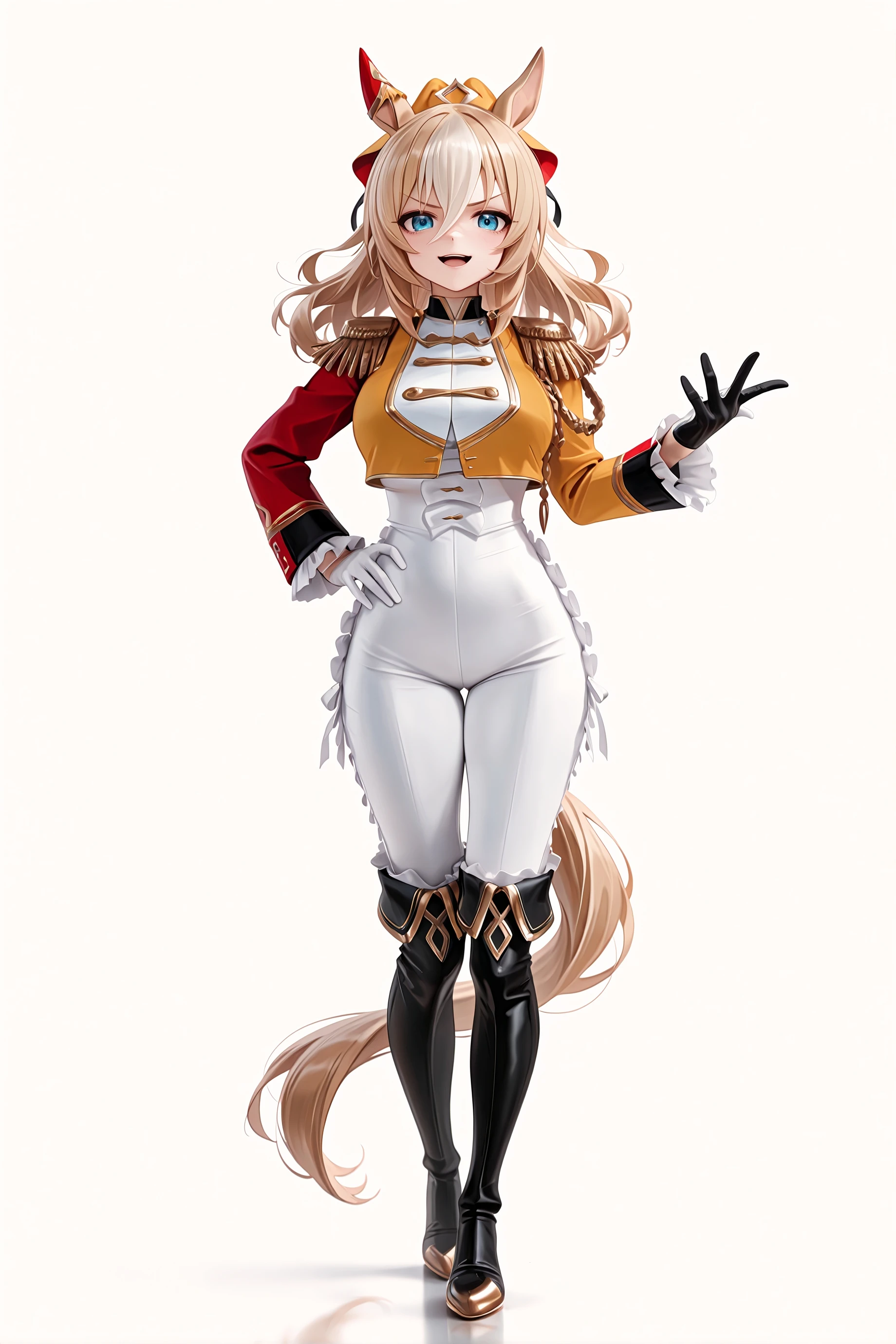 durandal \(umamusume\), horse girl, horse tail, epaulettes, frills, asymmetrical gloves, mismatched gloves, white gloves, black gloves, yellow jacket, white bodysuit, black footwear, asymmetrical footwear, knee boots,