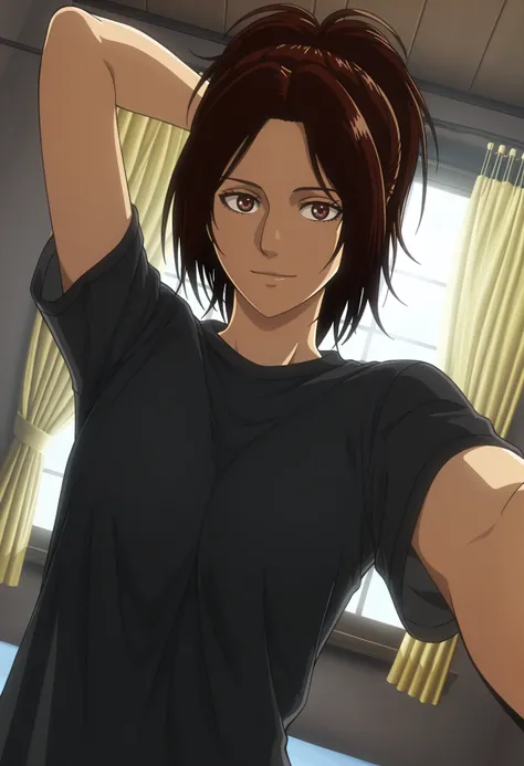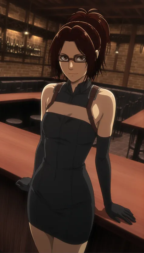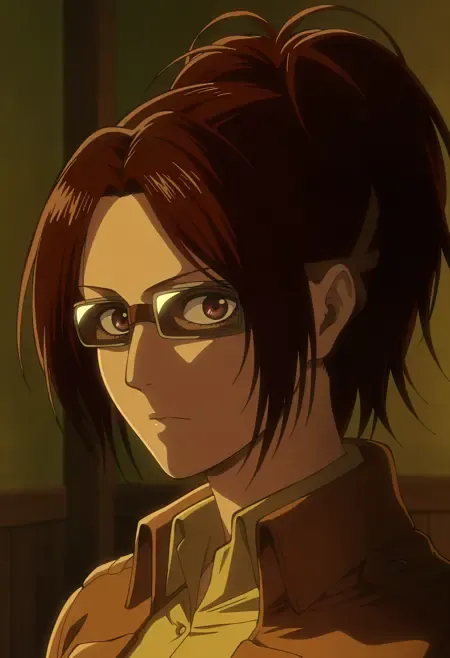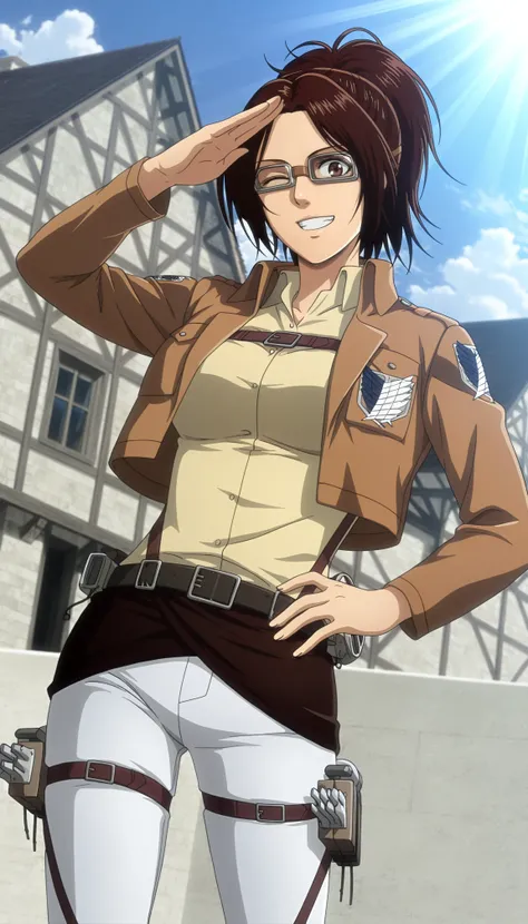 hange zoe, 1girl, brown hair, ponytail, goggles, paradis military uniform, jacket, open jacket, shirt, belt, white pants, thigh strap, boots, knee boots