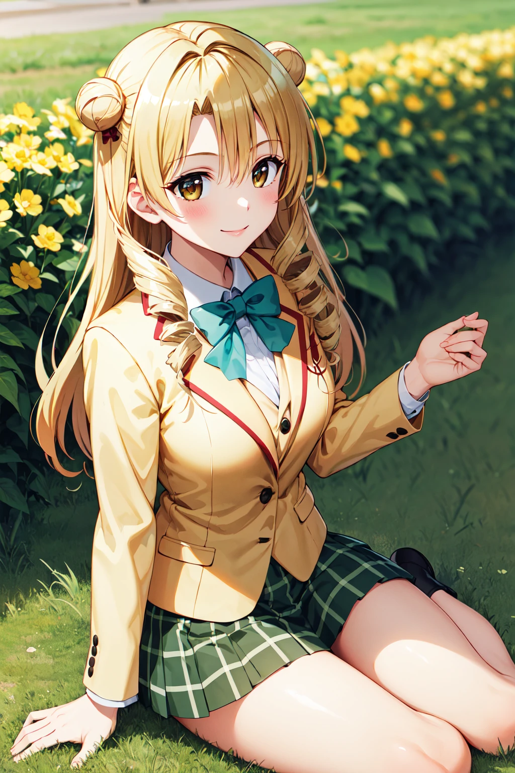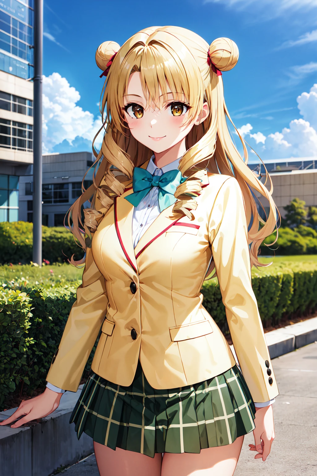 1girl, solo, long hair, blonde hair, double bun, drill hair, brown eyes, school uniform, green bowtie, blazer, yellow jacket, long sleeves, plaid skirt, green skirt