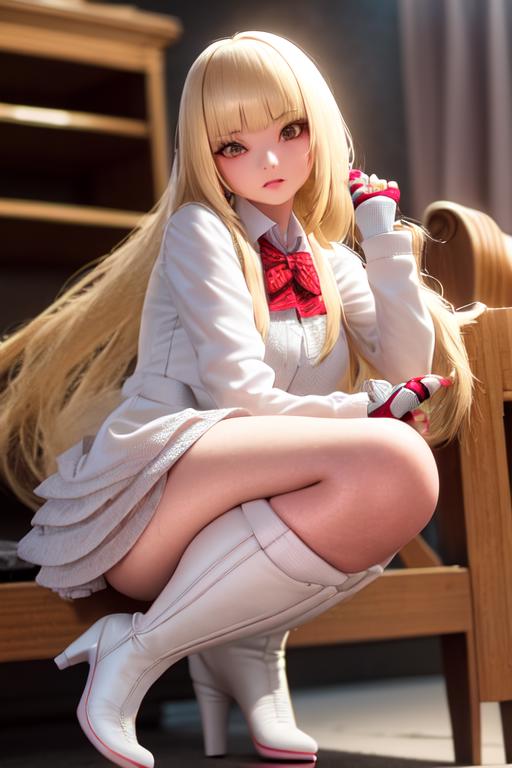 pt : <lora:last1:0.7>,1girl,bangs,blonde hair,blunt bangs,boots,bowtie,fingerless gloves,high heel boots ,long hair,red bowtie,hime cut, white dress
