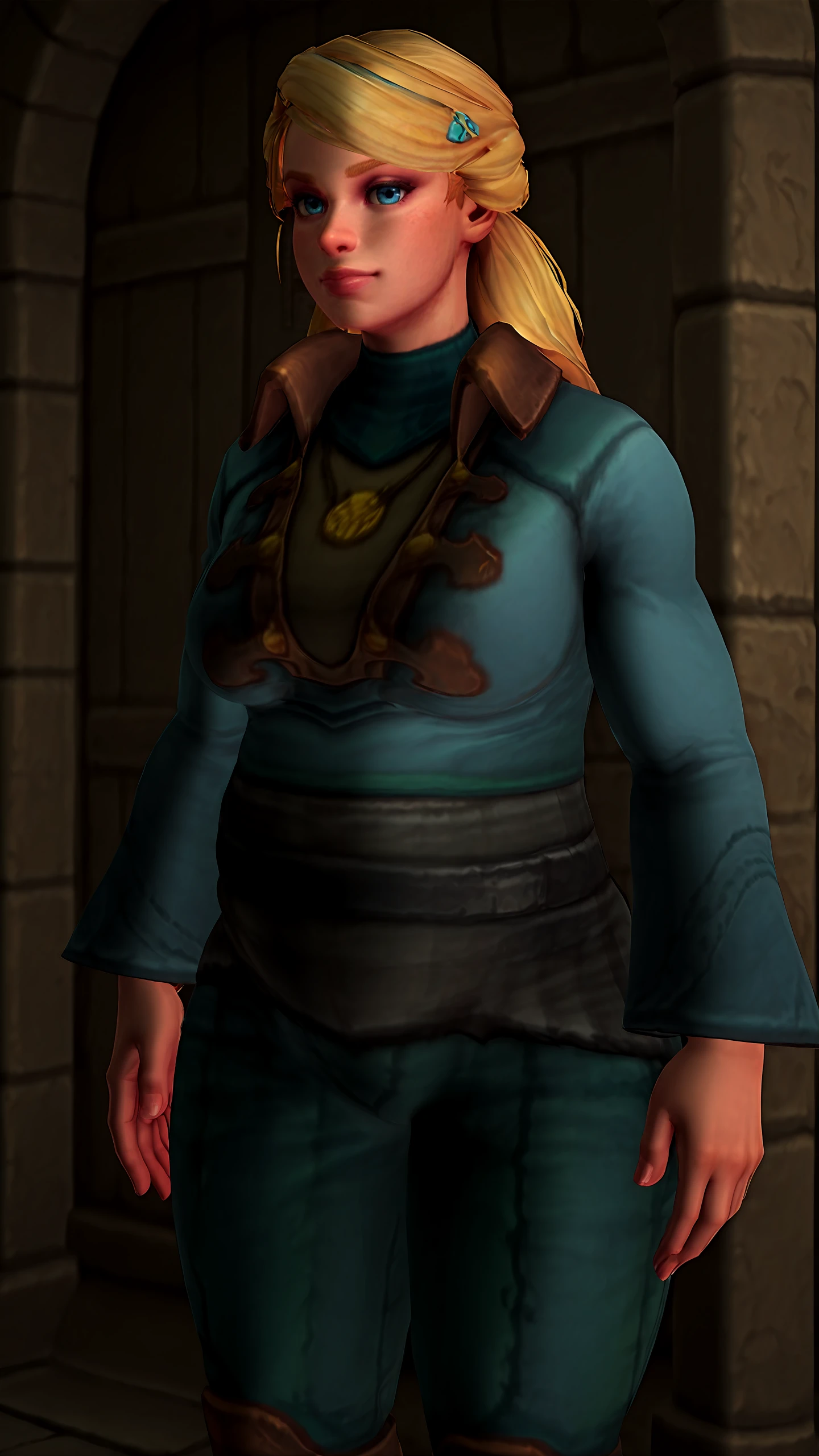 joanwow, blonde hair, long hair, blue eyes, chubby body, hairclip, armor