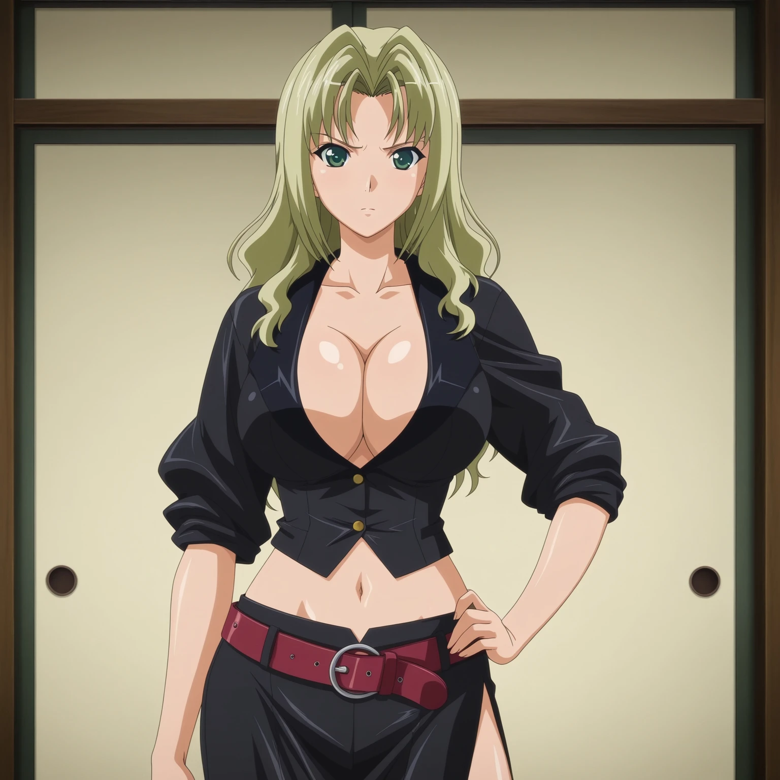 fubuki_(helter skelter), long hair, blonde hair, green eyes, large breasts,cleavage, midriff, navel,black clothes, sleeves pushed up, belt, side slit skirt,long skirt
