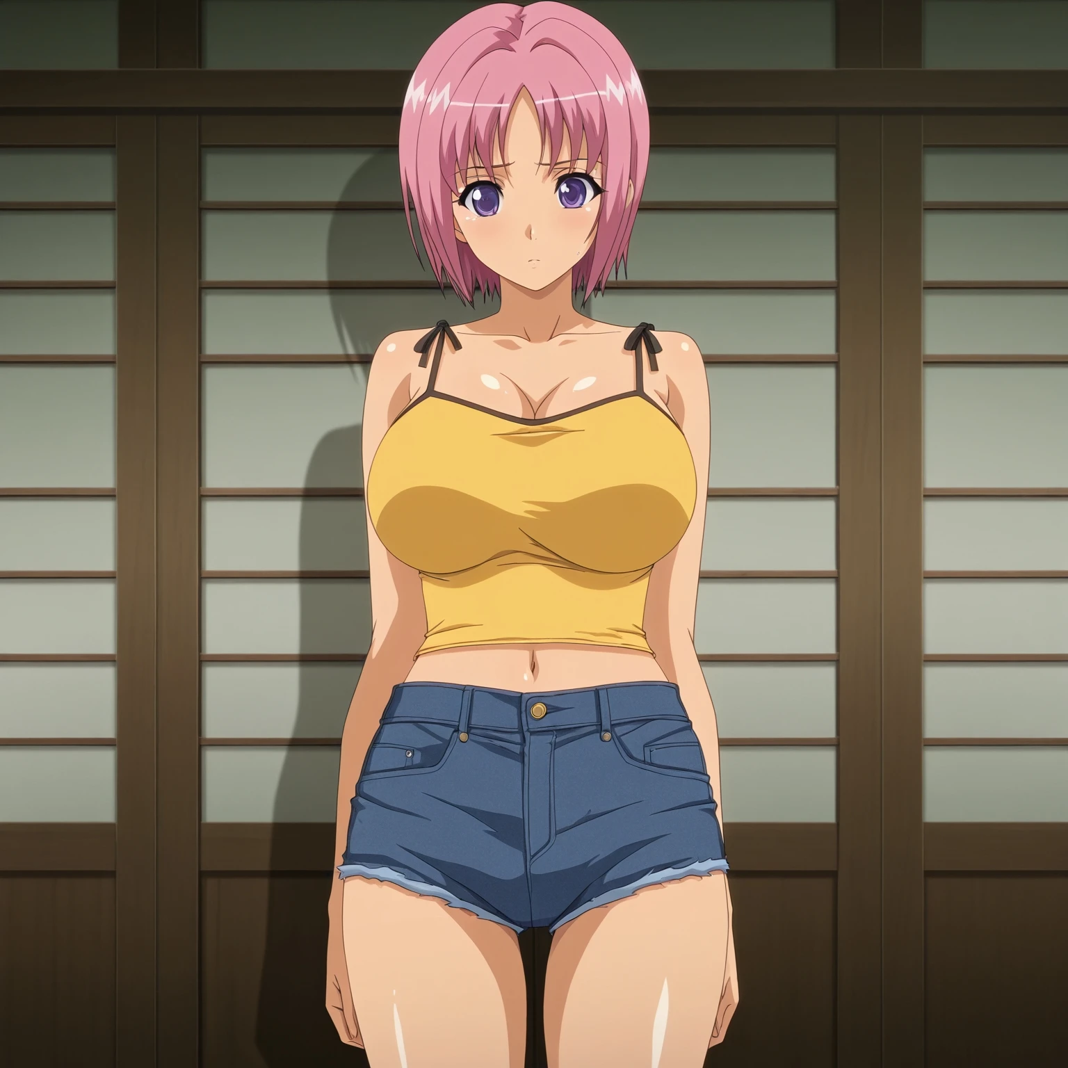 haruka_(helter skelter), pink hair, short hair,purple eyes,large breasts, midriff, denim shorts, denim,yellow camisole, bare shoulders