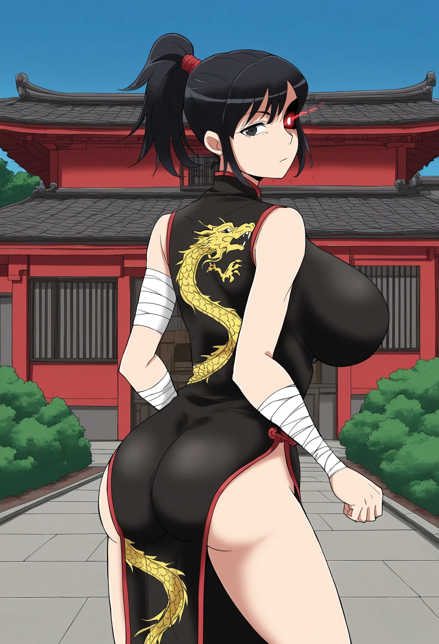 12.Mai Shinomiya,1girl,solo,mature female,red hair,ponytail,blunt bangs,sidelocks,black eyes,huge breasts,