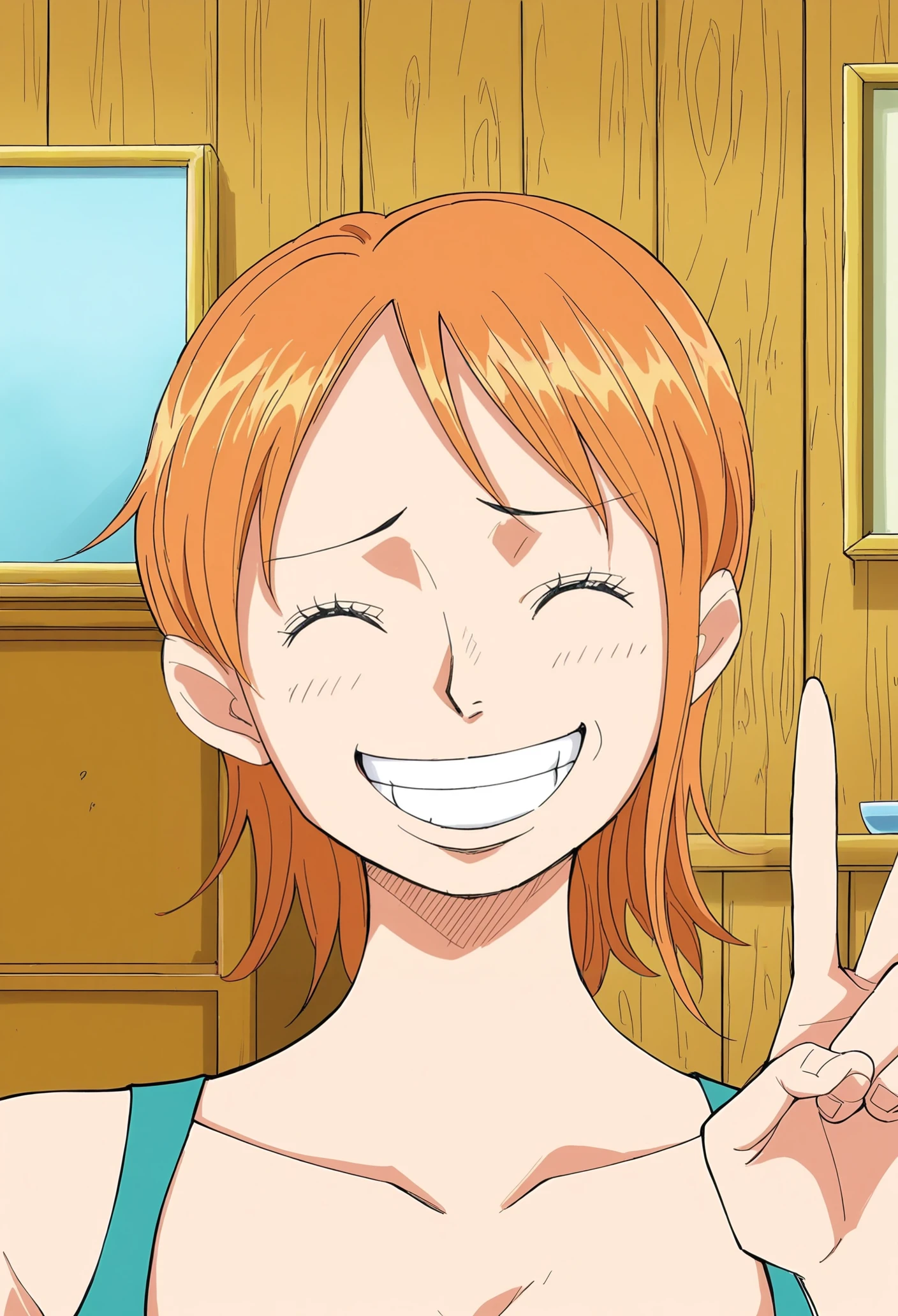 orange tank top,cleavage,blue pants,