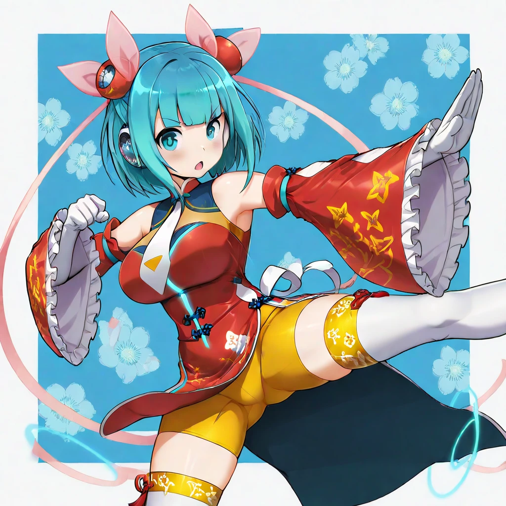 CeleRico, 1girl, detached sleeves, white gloves, white thighhighs, chinese clothes, china dress, blue eyes, blue hair, red dress, White necktie, wide sleeves, frilled sleeves, short hair, pink ribbon, red sleeves, frills, sleeveless, long sleeves, shoulders, blunt bangs, hair ornament, headphones, , yellow shorts, floral print,