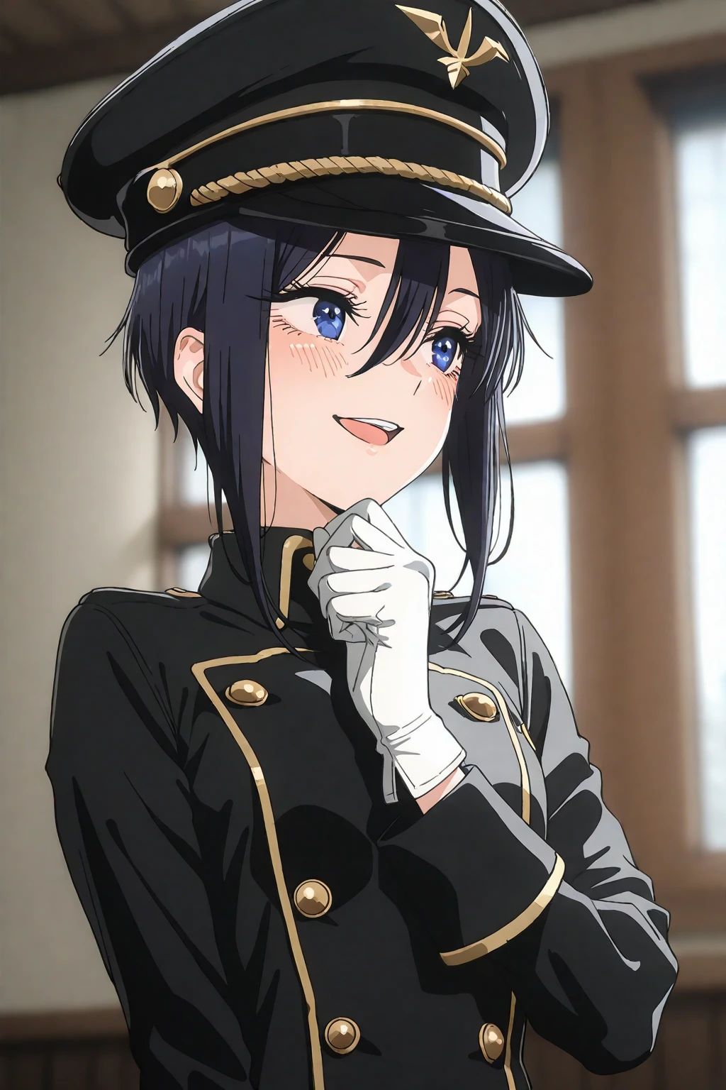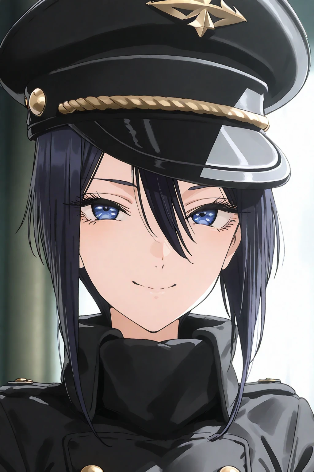 | Hair Style | long blue hair, hime cut, blunt bangs | Deep navy or royal blue hair with straight-cut side locks. |